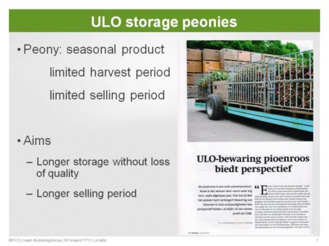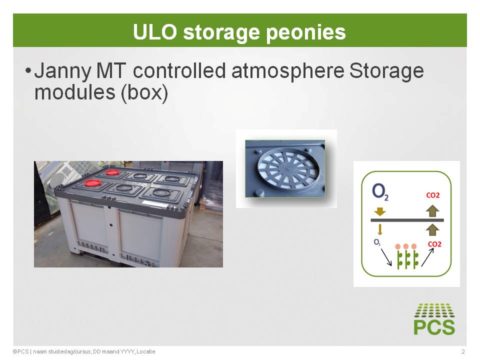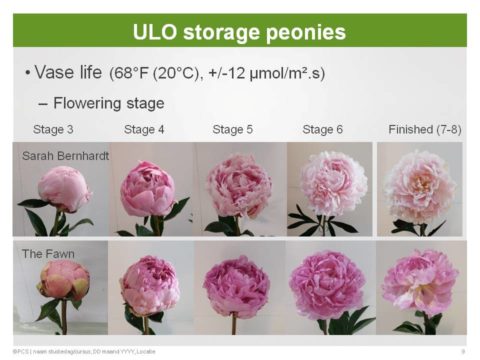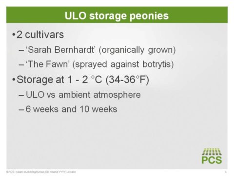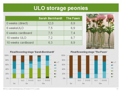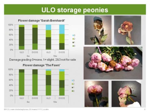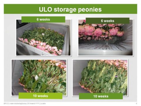 At 6 weeks some 80-90% of Sarah Bernhardt was still fit to be sold. But only some 15% was totally free from botrytis. Clearly ULO storage is not fit for organically grown peonies. At 10 weeks, results were even poorer, with half of them ready to be composted.
