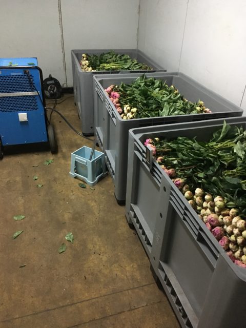 But apart from growing peonies in regions far north (the Baltic states (Lithuania, Estonia, Latvia) or some Scandinavian countries (Norway, Sweden, Finland)) would keeping them in ULO not be a viable option we thought? So we have bought a dozen ULO-storage boxes from Janny MT. In one of those boxes there’s room for some 700-800 stems and it is theoretically possible to keep them for several months. Dreams of selling peony flowers at Halloween come to mind, but we’d be glad if we got them until August or early September.