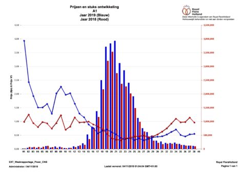 If it all works well, in a few years time peonies should be available over a longer period of time. But then the question remains whether it’s all worthwhile? From the prices growers fetched this year there’s little to support doing it large-scale. Look at the chart showing the numbers sold and prices fetched of peonies at the auctions of Royal Flora Holland. The blue bars show the numbers this year, clearly the numbers are still rising, at peak time some 4 million stems are sold weekly at the auctions (without the ‘direct sale’ of flowers that don’t pass before a ‘clock’). The blue line shows the prices this year, and the red one last year in the same weeks. As can be seen, growers didn’t receive a premium for keeping them in storage and would have been better of selling them during the peak season itself. If quality rises, then a market can be formed, but we might assume it’s an uphill struggle.