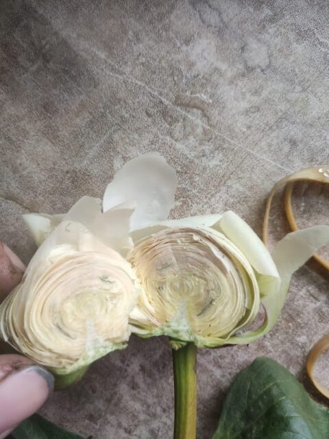 Peonies were stored for two months (the ‘mixed’ box) or three months (‘dry’ and ‘wet’). The mixed box at two months already showed that the ‘wet’ peony box would only contain even more botrytis infected ones, but we kept it closed anyway for comparison. The ‘dry’ peonies after two months looked fine, but there were some ‘grey’ petals underneath the outer petals (see further).