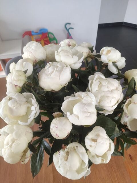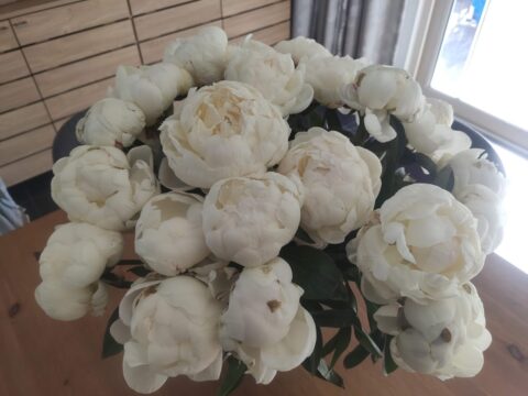 - ‘Dry’ peonies did have slightly dried out foliage, after recutting and placing on water they became fully turgescent again