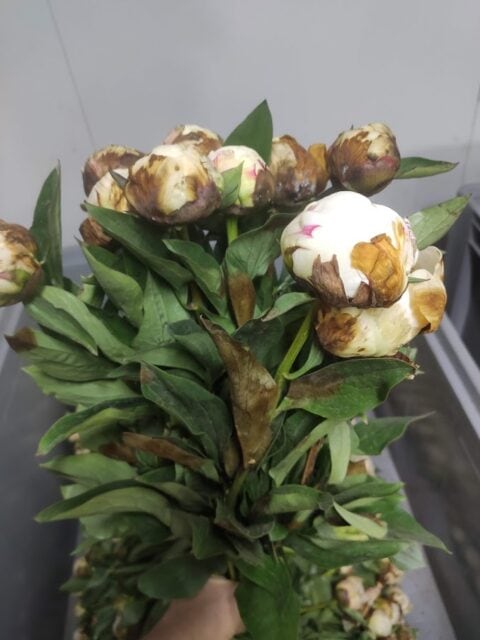 - ‘Wet’ peonies developed more botrytis than ‘dry’ peonies (15 flowers out of 50 for the ‘wet’ peonies developed botrytis at the end of the vase life but only 8/50 for the ‘dry’ peonies)