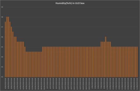 What about the Relative Humidity (RH)? As it turned out, the silicagel boxes did what they were supposed to do. The graph shows the ‘dry’ peony ULO box. It remained more or less constant around 95%, whereas last year it quickly rose to 100%. The ‘wet’ peony box showed the same results.