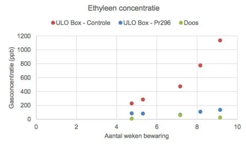 Ethylene concentration in the different treatments at the PCS (green: cardboard paper boxes; red: ULO box; blue: pyrimethanil + ULO box)