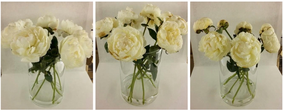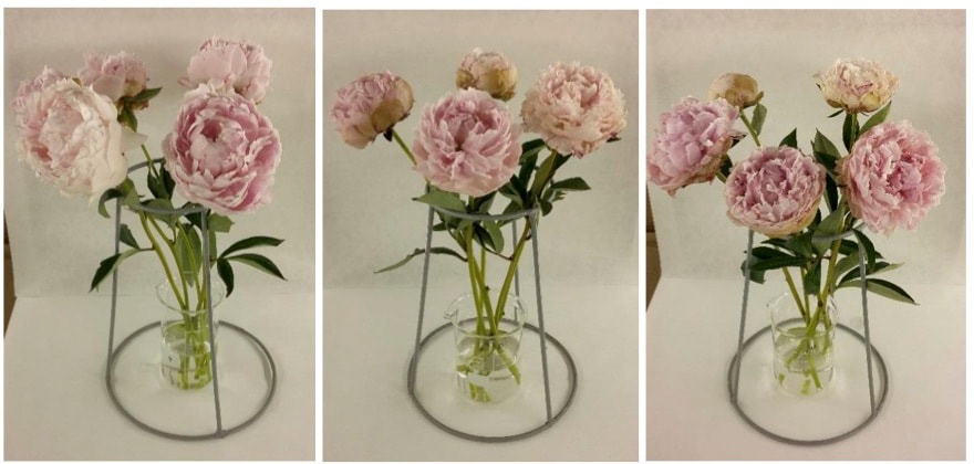 Madame Claude Tain after three days in water. Left immediately after cutting, middle after 10 weeks ULO, right after 10 weeks ULO + pyrimethanil treatment