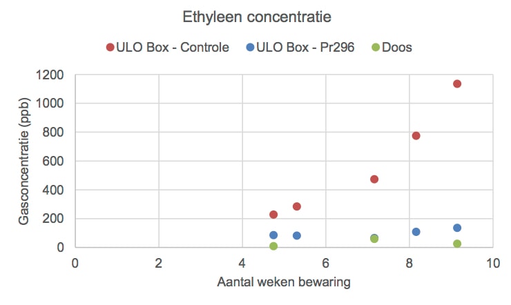One remarkable find from all measurements were the ethylene levels. Previous years we had already noticed that high levels of ethylene during cold storage don’t seem to result in lower quality or damage, even though in literature levels as low as 10 ppb (parts per billion) have shown to inflict damage on plants. Probably the low temperature protects the peony flowers from this. In the cardboard box ethylene could not accumulate as there was free interchange with outside air and there was an average 32 ppb ethylene concentration there. In the untreated ULO box, the ethylene concentration went up to 1,136 ppb. From previous years there was a clear correlation between high ethylene levels and the presence of botrytis, probably because the latter produces ethylene as well. The researchers were quite happy then to find that in the other ULO box, where the peonies had been treated with pyrimethanil, ethylene levels did remain under control, only to 136 ppb. This raised hopes for suppression of botrytis given the correlation between them in earlier years.