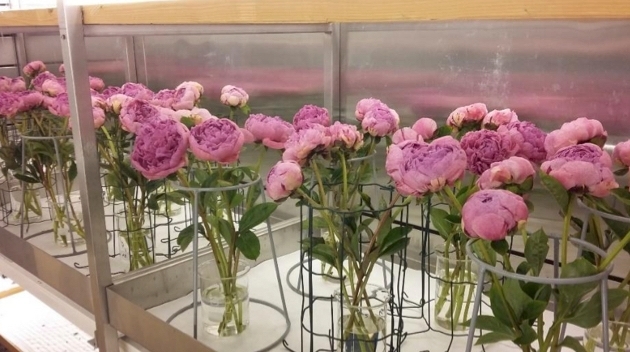 The Fawn peonies we used for our ULO storage boxes were cut halfway June, during dry weather, put in the boxes dry (thus no hydrating beforehand), cooled down and then the boxes were closed after some 24 hours with lots of silicagel in it. Into the boxes we also placed an average of 3 containers silicagel / month intended. Each could suck up some 500 ml of water and given that we aimed for 2 – 4 months, some 6 to 12 such containers were placed in the ULO boxes. The number of stems in it was between 700 and 1,100, always leaving free some 10 cm at least from the top cover of the box. The time of closing those boxes was June 12-14 and temperature was kept below 1°C. The advised number of stems in an ULO box is some 800, we also had some with those numbers. The 1,100 was because we could simply but so many in and it would not be surprising to find that other growers would want to do that as well for it obviously restults in a lower cost per stem. The 700 stems box was only half full, this was the very last one we filled, June 14 and it contained some smaller stems that had been laying in the cold storage for over a week but hadn’t been prepared due to time constraints. Given that at that time wholesale prices were at a season’s low and we had one ULO box left but no other peonies to fill it with we simply decided to use them. Even though they were somewhat dried out and although we normally only use larger fresh ones.