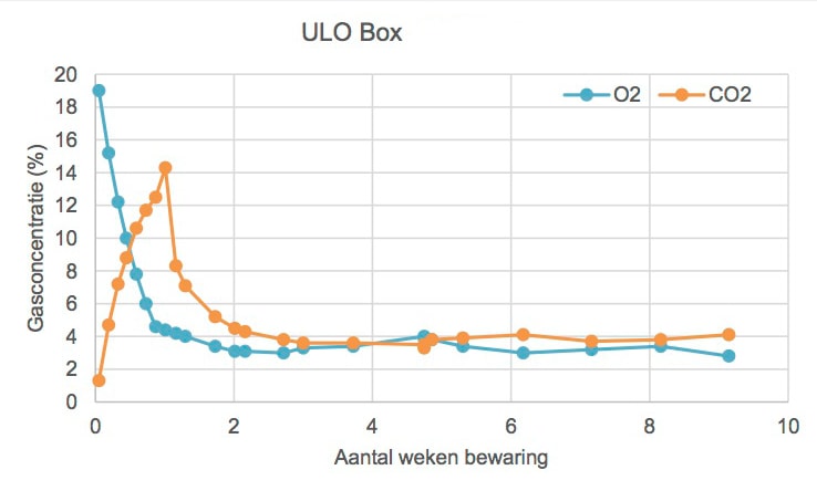 During the period that the peonies were in those boxes, regular measurements were taken of temperature, oxygen, CO2 and ethylene. As all lids were closed at once, oxygen levels went down very fast. So fast in fact that when I checked a week later, oxygen levels were below 1% in a few boxes. This I had not expected given the results of previous years and I thus opened a few lids to raise oxygen levels more towards 5%. At the same time CO2 reached higher levels, something which might also help deter botrytis, although these high CO2 levels quickly went down when one or more lids were opened. This shows that an O2/CO2 meter, although very expensive, is no wasted money when working with these boxes. At the research centre, measurements were better followed up and they never got this low in oxygen as can be seen from the following graph.