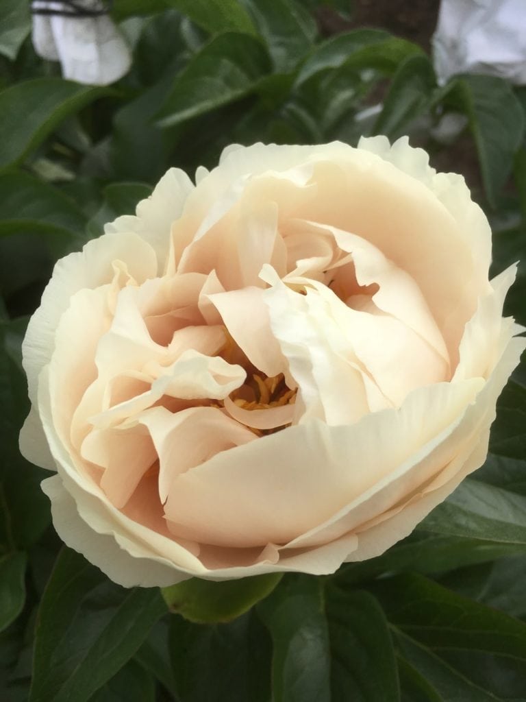 Tranquil Dove is a hybrid peony that derives from a somewhat shady cross. It’s an open pollinated seedling from Halcyon, a strain of very alike plants. Halcyon derives from some P. lactiflora cultivar, and the