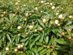 Al Rogers was named after the American nurseryman who wrote an excellent book about peonies. It is an outstanding lactiflora cultivar. Rather short, it is standing perfectly upright and is extremely floriferous. the flowers are average sized, well formed doubles. The foliage is dark green, it is a healthy plant and a fast increaser. What is also remarkable about this cultivar is that the average two to three sidebuds are all on the same height as the main flower, so the plants look filled with flowers when blooming. For the average garden this might arguably be the very best double white peony. As a cutflower however the length of the stems and somewhat smaller size of the bud will render it virtually useless unfortunately.