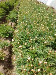 Al Rogers was named after the American nurseryman who wrote an excellent book about peonies. It is an outstanding lactiflora cultivar. Rather short, it is standing perfectly upright and is extremely floriferous. the flowers are average sized, well formed doubles. The foliage is dark green, it is a healthy plant and a fast increaser. What is also remarkable about this cultivar is that the average two to three sidebuds are all on the same height as the main flower, so the plants look filled with flowers when blooming. For the average garden this might arguably be the very best double white peony. As a cutflower however the length of the stems and somewhat smaller size of the bud will render it virtually useless unfortunately.