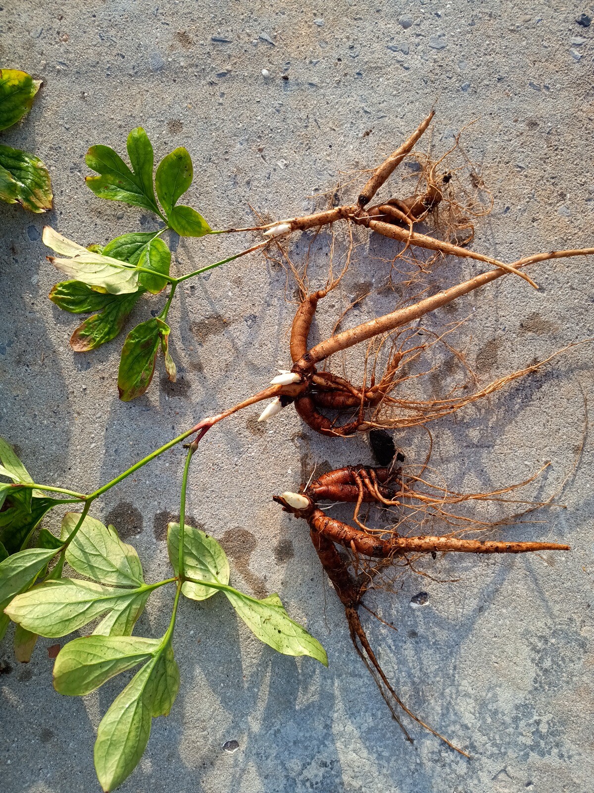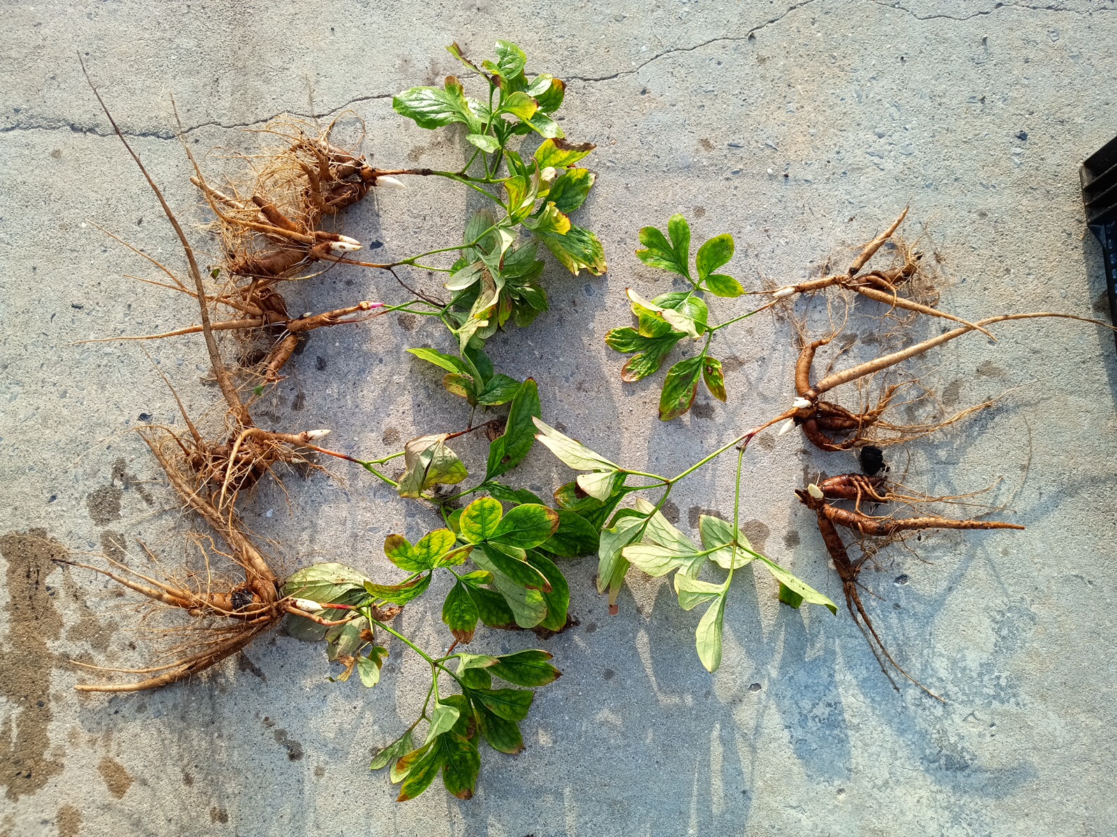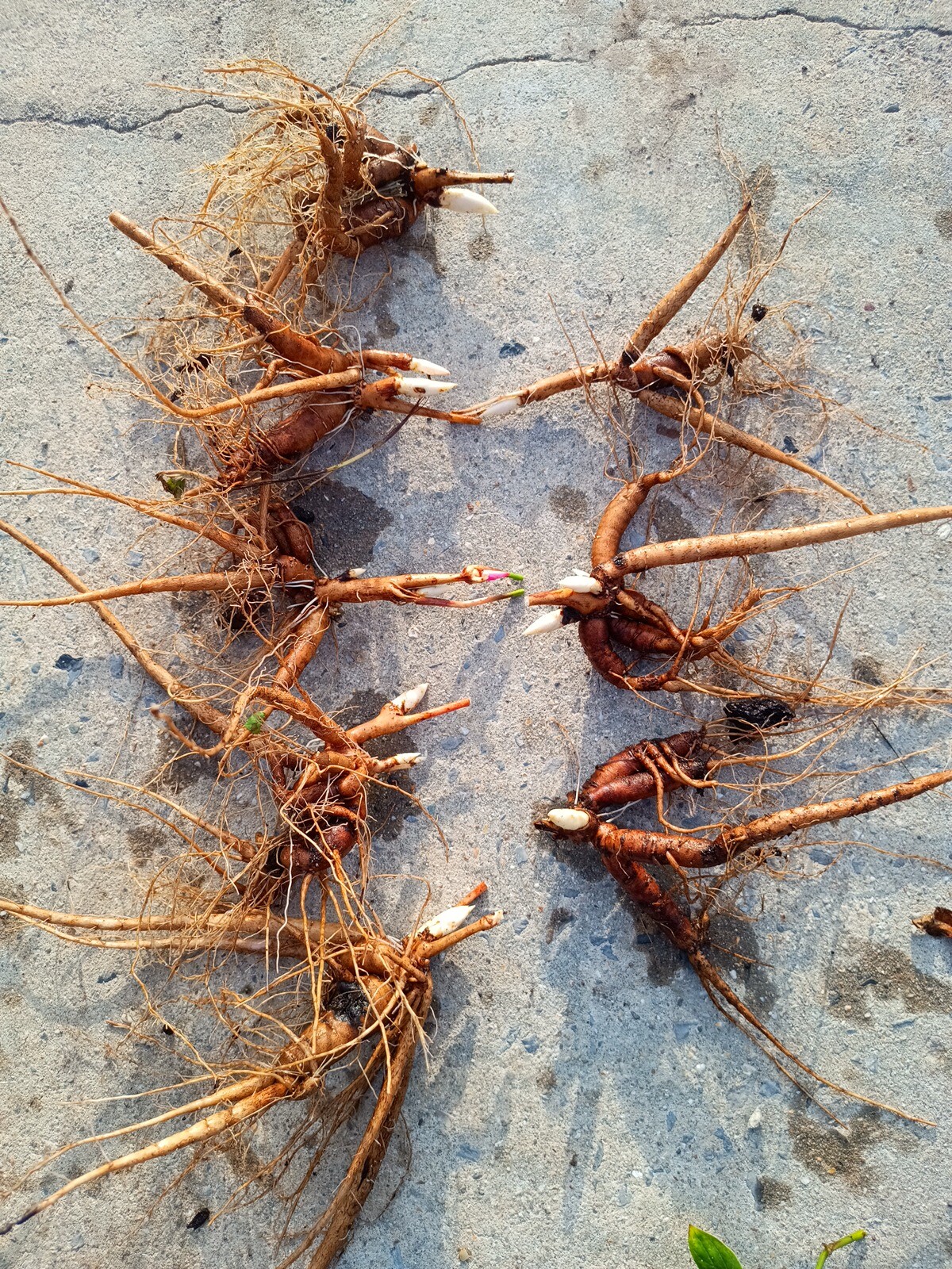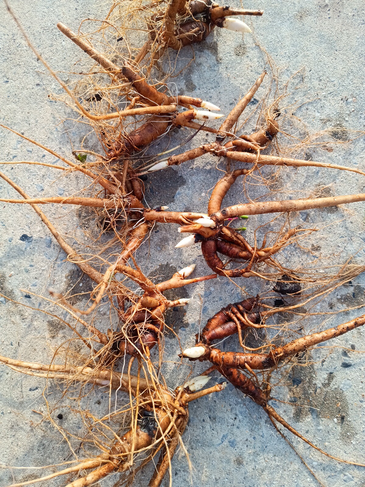 In 2022 I received my first tissue-cultured plantlets of peony Mieke Bral and I did a small experiment. I dipped most of the plantlets for a quarter of an hour into a solution of some biological fungicides/insecticides and biostimulants. Strains of bacillus amyloliquefaciens, beauveria bassiana and trichoderma were all in the mix. A few did not receive this treatment as a comparison. They were all planted in the same spot and grown under identical conditions. In 2023 I dug them and took some pictures of plants of somewhat the same size (above ground that is) both treated and untreated. On the left side of the images you have the treated ones (5 plants) whilst the untreated ones (3) are on the right.