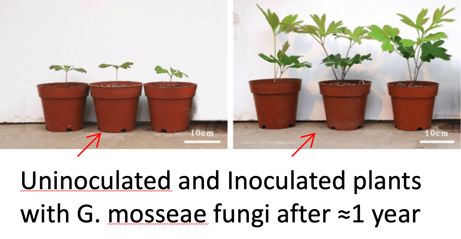 Then there are also Arbuscular Mycorrhizal Fungi (AMF). Funneliformis mosseae (formerly glomus mosseae) is for example one that tends to give good results as you can see from the next image showing intersectional hybrids from tissue culture after the same growing period. Trichoderma strains are some others giving good results. Together with some bacteria that also suppress diseases (thus in fact again a biopesticide/fungicide), bacillus amyloliquefaciens for example, you can get good results. These three fungi/bacteria are in my opinion currently the best way to apply biostimulants to your peonies. They can be applied as a dip before planting them and from my observations they are worth their money. Both other growers and researchers tend to agree here. My own results shown above where from trichoderma and bacillus amyloliquefaciens (beauveria bassiana is a fungus that merely kills pests, so not really a biostimulant). The images from Don Smith below made want to try AMF as well. We have no results with peonies from this so far but if we do we’ll add them here as an update somewhere in the future. We did note however that they are not always easy to obtain, AMF themselves are not difficult, but if you really want the funneliformis mosseae in them, the range of products decreases somewhat. Then there were some which simply didn’t dissolve in water and were unusable in a dip before planting so we had to disperse them into the soil directly. Others that you could dissolve took months and months before they could be delivered. Some have only a short shelf life after which they are useless and still others need to be kept in cold storage to remain viable. So it’s fair to say that it’s not as easy as regular chemicals. But given the decreasing availability of regular chemicals and the trend towards more sustainable farming, it’s a road which cannot be ignored.