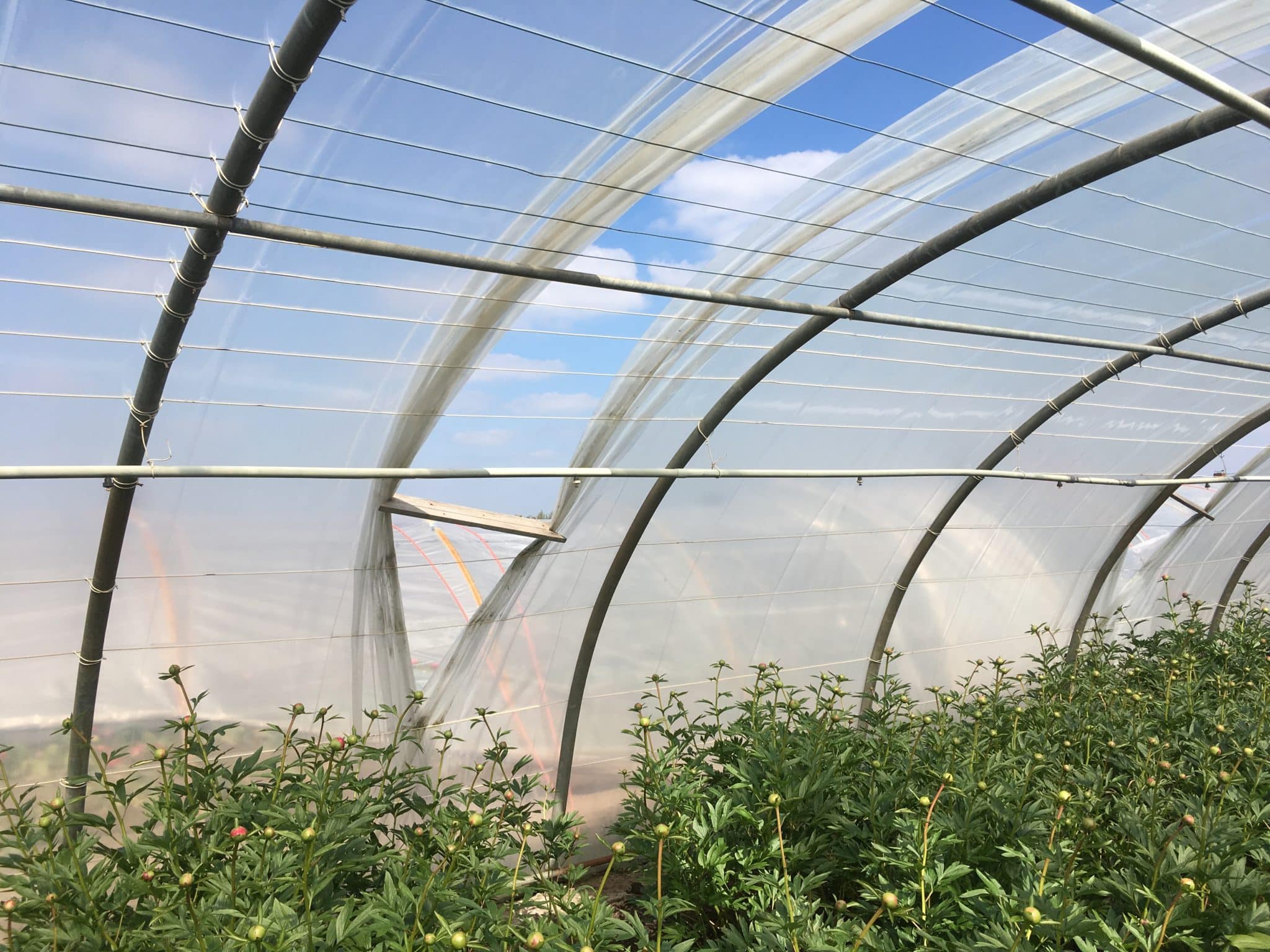 A short time ago we posted an image of one of our polyethylene tunnels with peonies in. This was just to show how they were growing, but as it turned out some people showed some interest in it and wanted to know some more details about how we work with these. So here’s a small overview of why and how we do this.