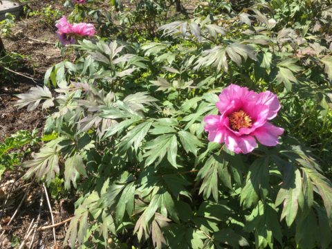 “Unlike Japanese P. suffruticosa cultivars, P. delavayi often imparts poor flower carriage to hybrid offspring, in the form of nodding blossoms. Many first generation hybrids (F1’s) have a curve in the flower stem, which causes a downward carriage, often referred to as the “lutea hook”, directly inherited from P. delavayi. This has been a major impediment to enjoying the large voluptuous flowers in many of the hybrids, as they face down, are hidden in the foliage or touch the ground. The cultivar ‘Souvenir du professeur Maxime Cornu’ has flowering habits that exemplify these characteristics, as do many others to an equal or lesser degree.”
