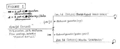 See figure 1 (I’ve diagrammed their assumed genetic makeup in which I replace Don’s “n” (page 5) with “m” and “d” to represent the moutan & delavayi-lutea sets of chromosomes.)