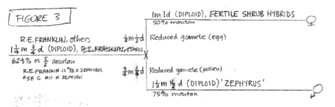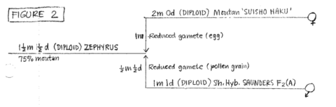 Leda seemed sterile both ways, Zephyrus appeared to be seed-sterile, but its pollen, though difficult to extract, turned out to be quite effective. (Under a microscope only 10% of the grains appeared plump/well formed, but that 10% is potent with other fertile shrub hybrids.) I reasoned that if Zephyrus was 75% moutan (it had quite good carriage although short stemmed), that my seedlings were 50% moutan and that if reduced gametes were the rule, crosses between the two would inherit half of 50% and half of 75%, thus resulting in 62.5% moutan genes, enough to provide moutan type carriage to the blossoms (see figure 3).