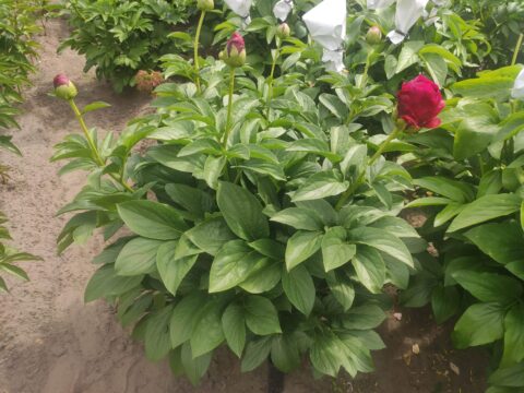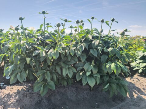 The most remarkable thing are the stems, being so sturdy, straight and upright. The single flower on each stem is an advantage when using as a cut flower, although in the garden sidebuds would probably have been preferred. The open buds are not a plus in very rainy weather as they can easily hold water for a very long time. Cutting them at the right stage is difficult because they remain in bud for a very long time. We used to cut them here when some petals changed colour from blackish red to dark red. They do open very fast thereafter, so cutting twice a day is usually necessary. Nowadays we also cut them when the buds can be easily pressed together, which is slightly earlier and they seem to open well. Still, it doesn’t take the usual three days for the flowers to open fully like with other cultivars. That limits the commercial value as a cut flower somewhat. When open it does last longer in a vase than most other cultivars however. The susceptibility to TRV (Tobacco Rattle Virus) results in symptoms that differ from year to year, sometimes not showing anything at all, and apart from the slight yellow patterns on the leaflets there seem to be no negative consequences. The leaf nematodes are more difficult, mowing down the stems earlier during late Summer can help alleviate the problem. Note that a hot water treatment of the roots is more difficult with Old Faithful, there’s no room for error as there is with P. lactiflora cultivars: one year we lost some 75% of divisions from this cultivar due to this whilst most others didn’t suffer.