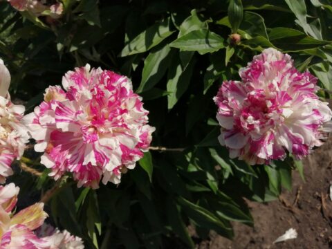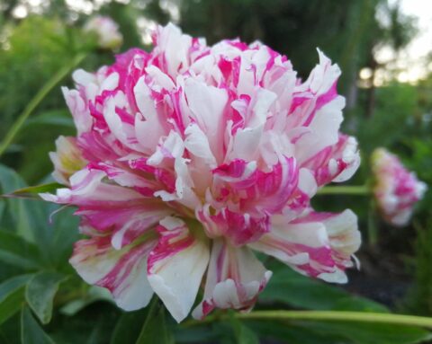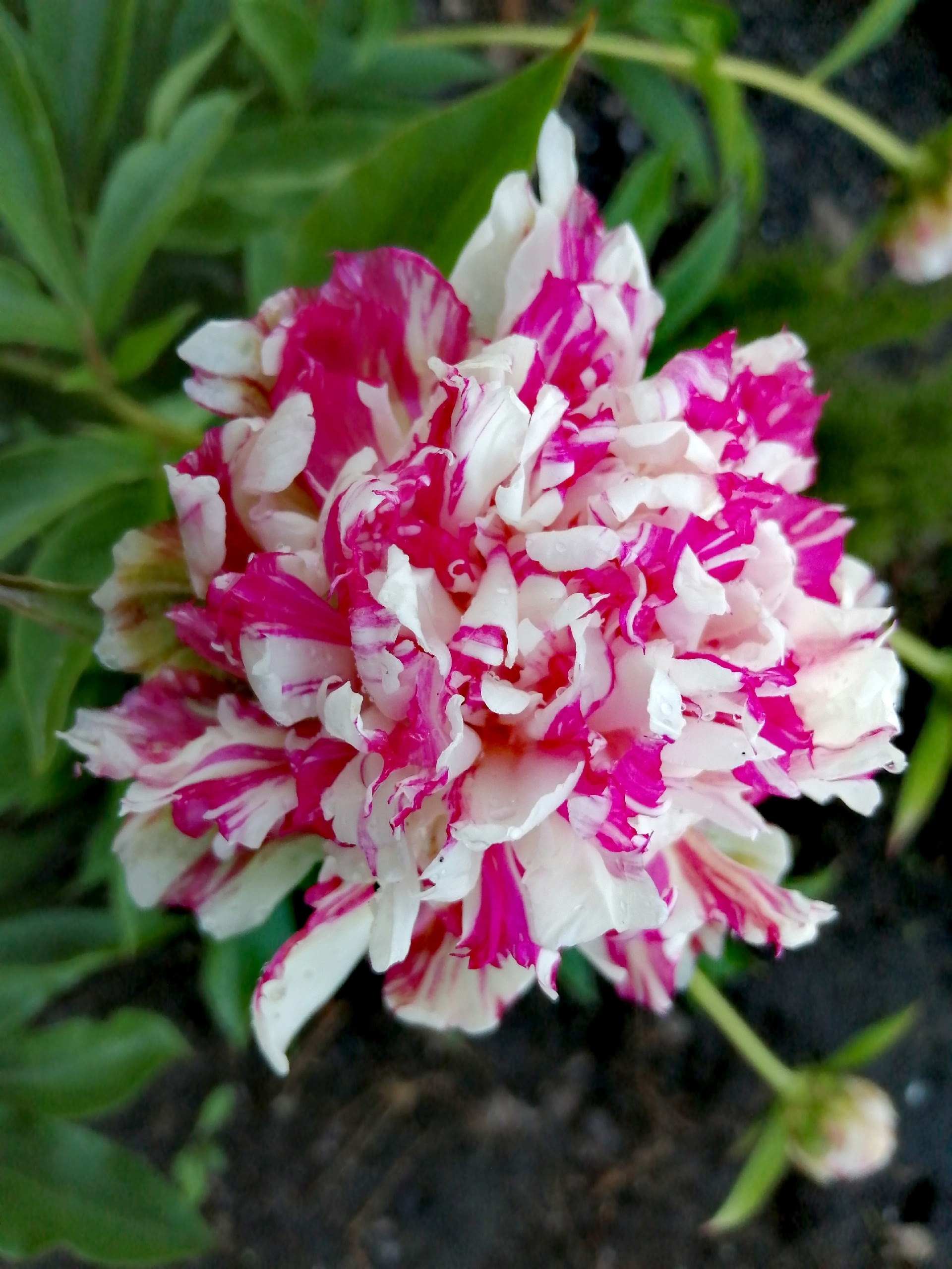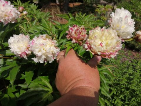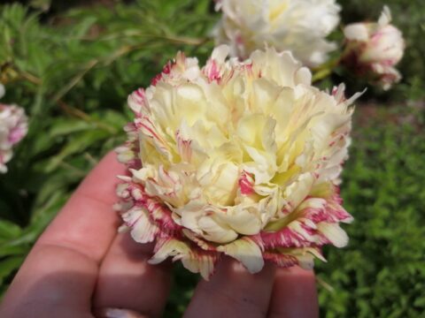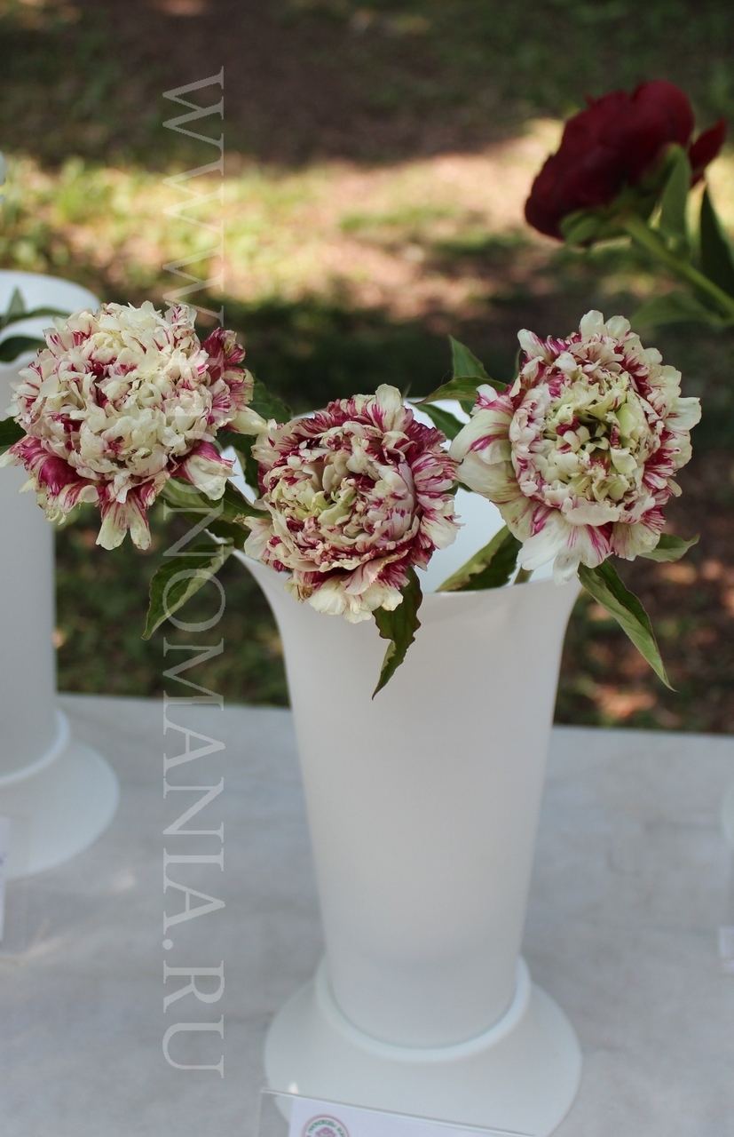 Жостовская Роспись (Zhostovo Painting) (Bredikhin, 2020). Lactiflora (Twitterpated x Green Lotus) x Gold Mine. The flower is bomb-shaped, densely double, with red-crimson strokes scattered densely over a white background. The color is stable, and the density of the strokes is always uniform. The flower diameter is up to 15 cm. It may be larger in more fertile soil. There is no scent. There are 2-5 carpels, which are bare and yellowish in color, and the stigmas are bright crimson. Lateral buds are virtually absent; mature bushes may develop a single lateral bud. The height of the bush is up to 1 m. The flowering period is medium to mid-late. However, seedlings emerge later than other lactifloras.