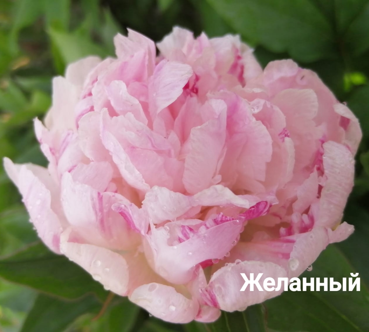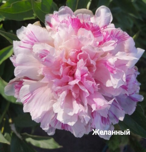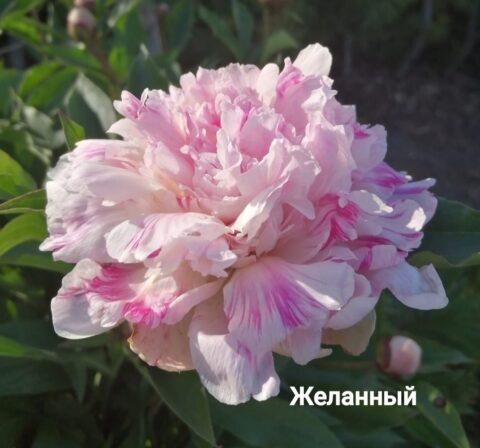 Желанный (Desired) (Bredikhin, 2018)A variety from the P. lactiflora family. Double, hemispherical. The flowers are white-pink or delicate pink with numerous small, sparse, red-crimson strokes. The flower size is 15-17 cm. There are no stamens. There are 3-5 greenish carpels, and the stigmas are pink.