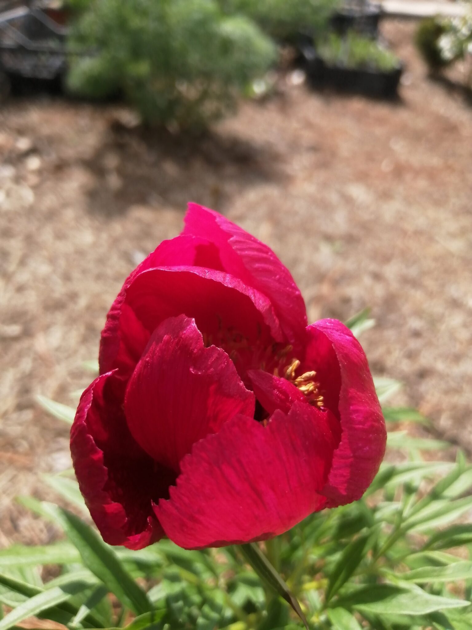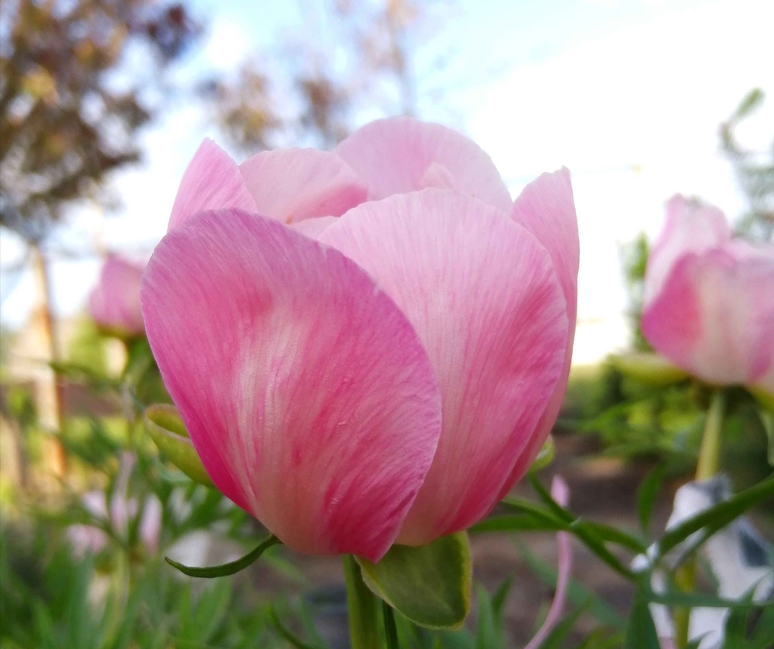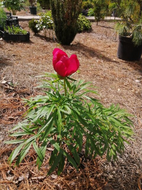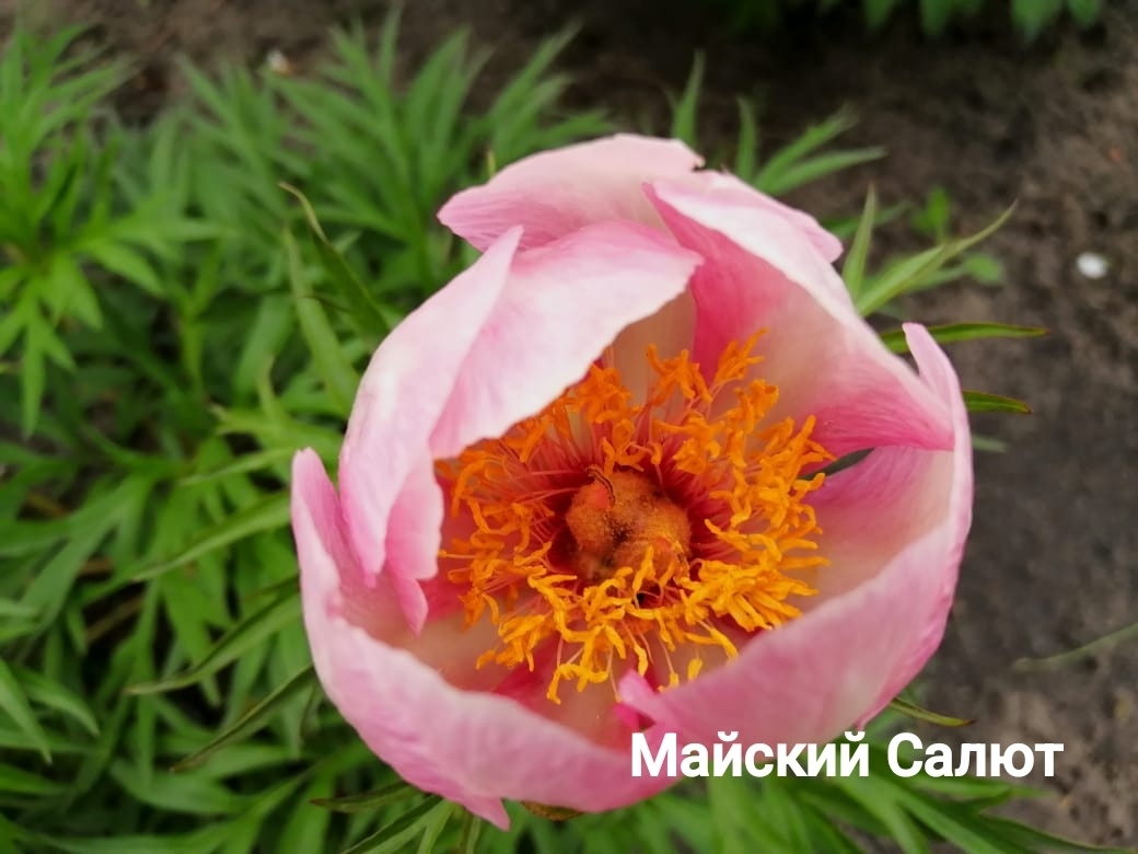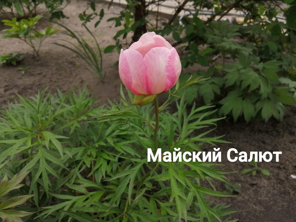 Майский салют (May Fireworks) (Bredikhin, 2020) Hybrid (P. mlokosewitschii x P. tenuifolia). One of the earliest hybrids, it blooms at the same time as the tenuifolia variety. The flower is simple, cup-shaped, reminiscent of a tulip bud when half-opened. The color is soft pink, with a slight flesh tint, with a wide, blurred border of a cooler pink along the edge. The flowers fade slightly toward the end of flowering. The fragrance is pleasant. There are 2-4 carpels, which are pubescent and light green. The stigmas are pink. Fertile, setting apparently viable seeds, but germination has not yet been observed. The leaves are heavily serrated, half as thin as those of the ‘Nosegay’ variety. Height: 80-90 cm. The stems and petioles are usually brick-colored. This variety thrives in partial shade, where it retains its foliage until autumn. In the sun, the shoots die off by the end of August.