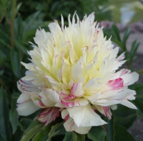 Жостовская Роспись (Zhostovo Painting) (Bredikhin, 2020). Lactiflora (Twitterpated x Green Lotus) x Gold Mine. The flower is bomb-shaped, densely double, with red-crimson strokes scattered densely over a white background. The color is stable, and the density of the strokes is always uniform. The flower diameter is up to 15 cm. It may be larger in more fertile soil. There is no scent. There are 2-5 carpels, which are bare and yellowish in color, and the stigmas are bright crimson. Lateral buds are virtually absent; mature bushes may develop a single lateral bud. The height of the bush is up to 1 m. The flowering period is medium to mid-late. However, seedlings emerge later than other lactifloras.
