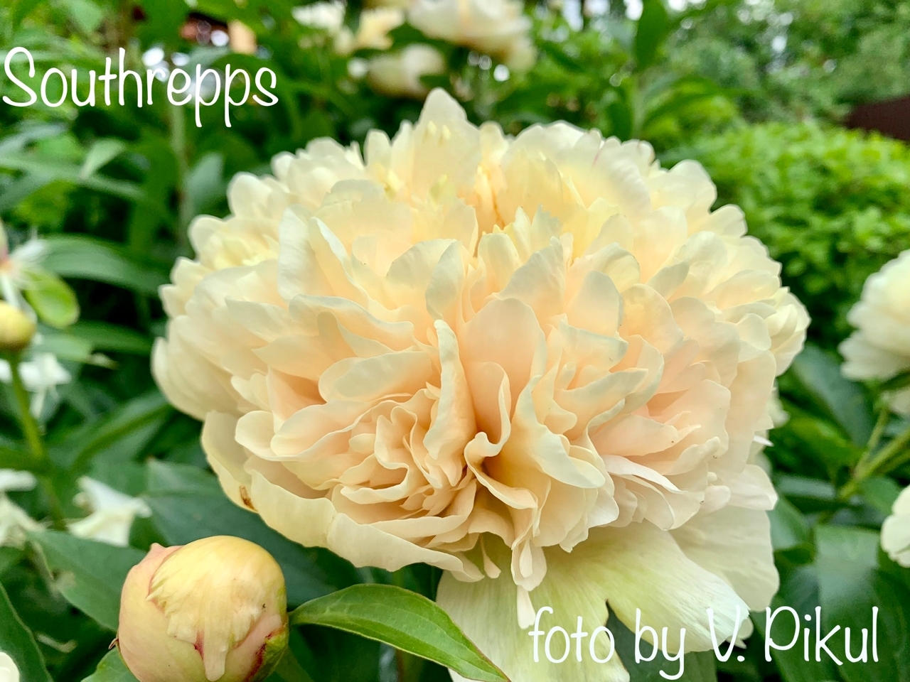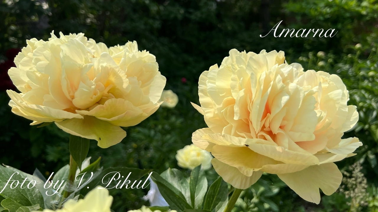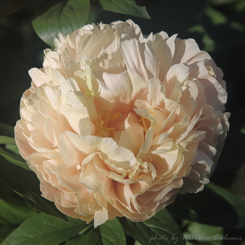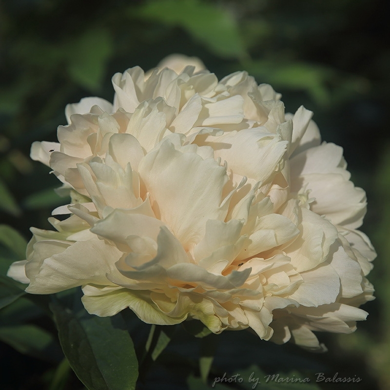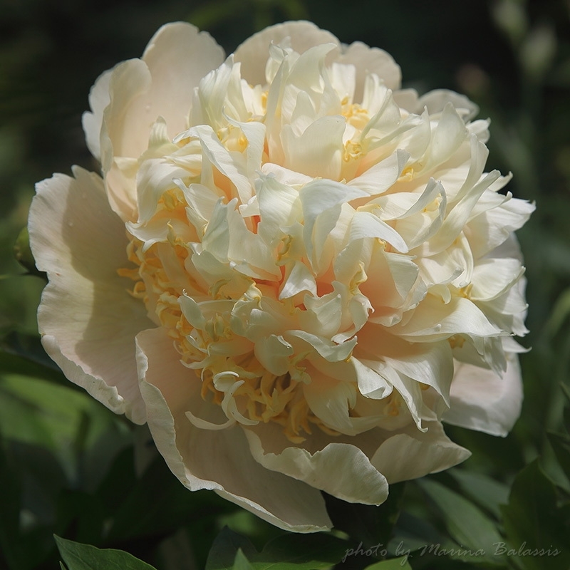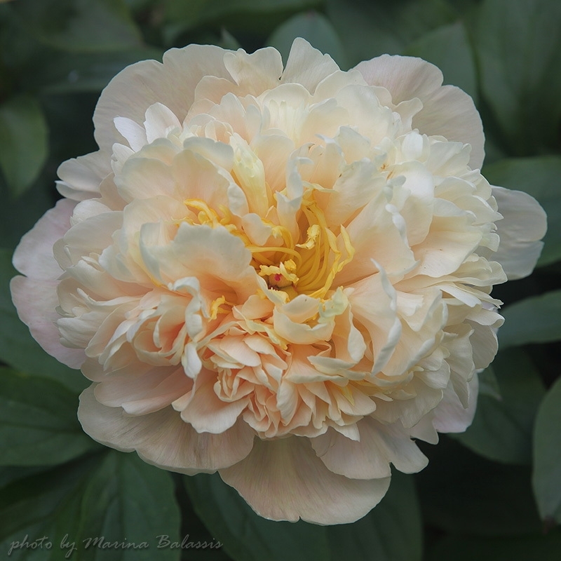 Description by Viktoriya Pikul: “There’s literally everything I love about the Maly Semyachik peony: it’s a magnificent, tall bush that dominates the garden; it has perfectly shaped, large, heart-shaped leaves with distinct veining; it has large, double-flowered blooms on thick stems; and it has and extraordinary flower color, which is difficult to sum up in a single word (pale cream with lilac-pink and lemon-green accents).”