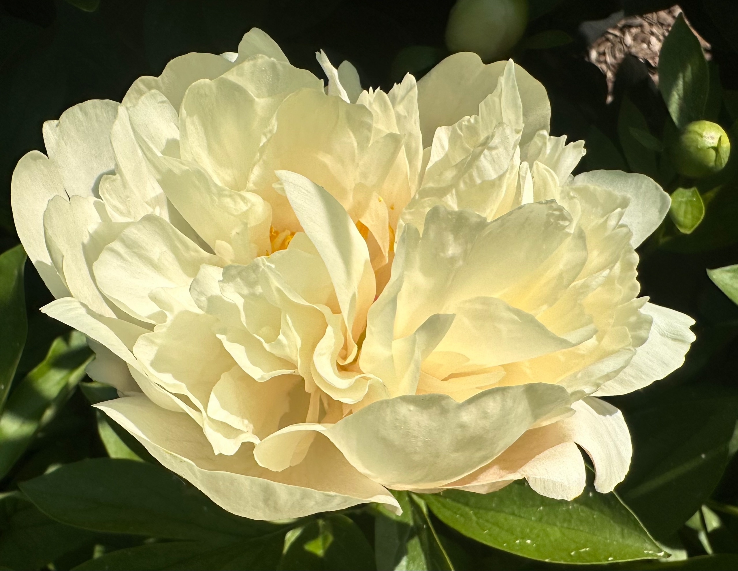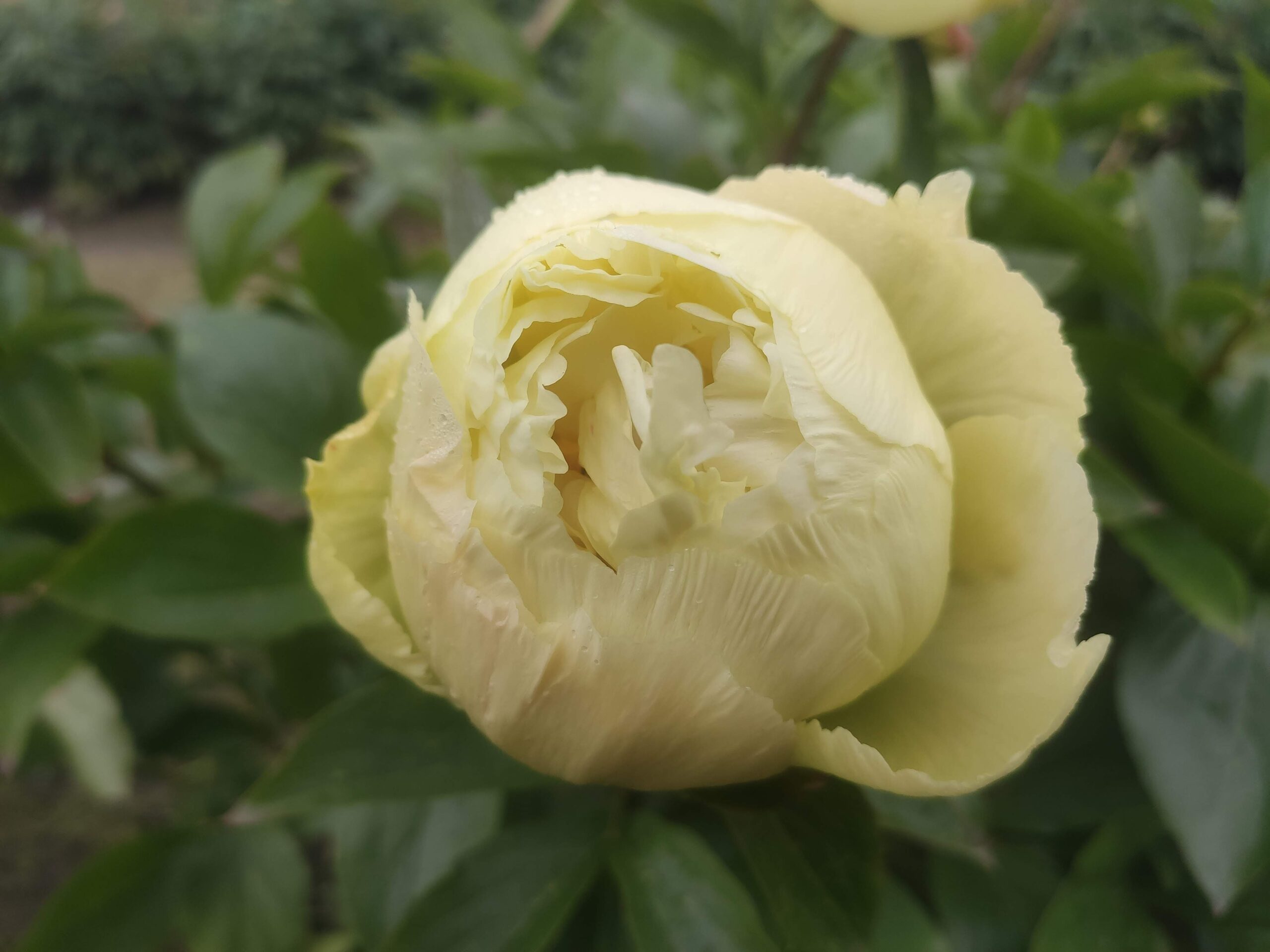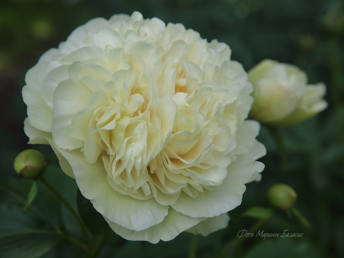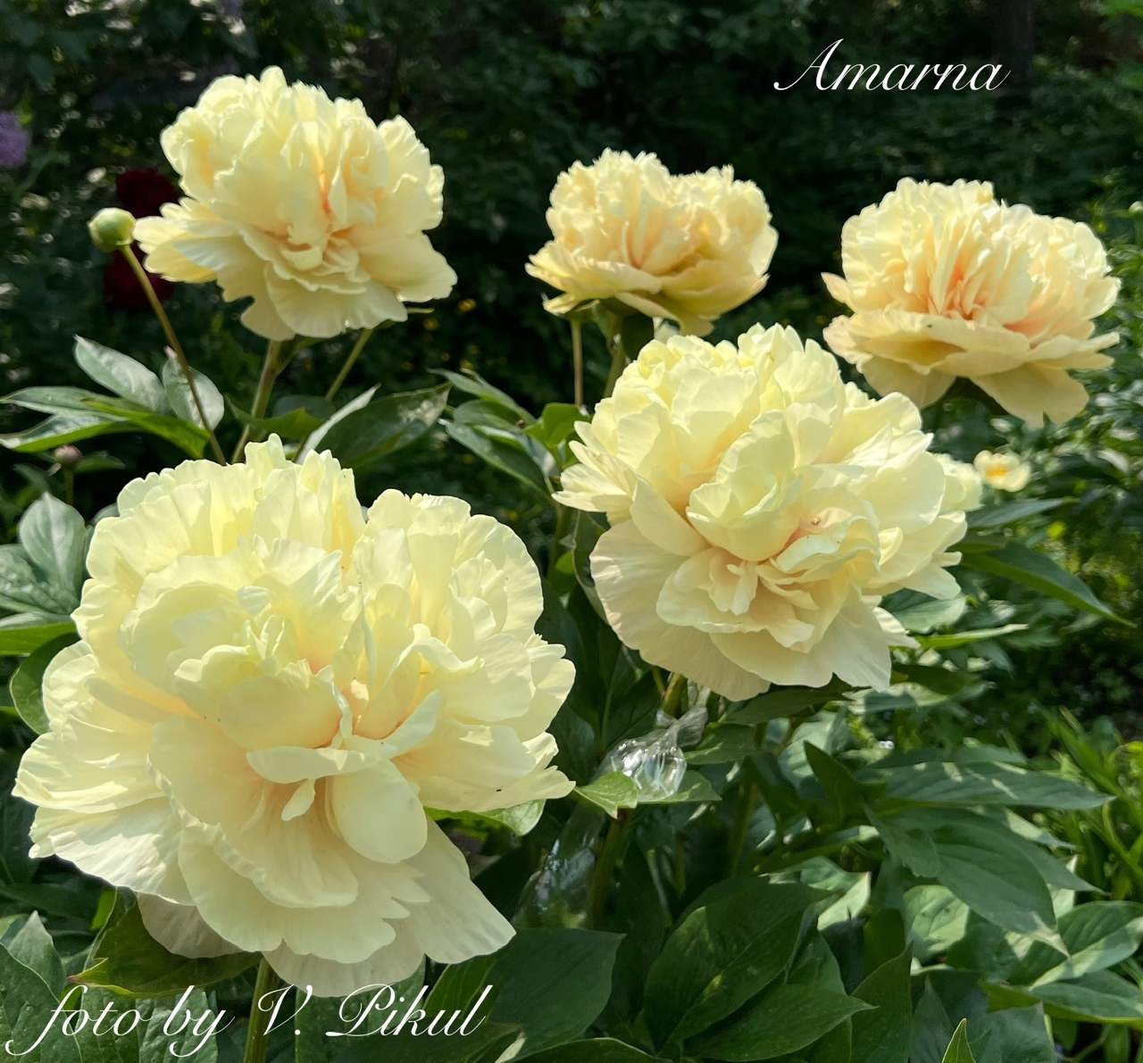 Description by Viktoriya Pikul: “There’s literally everything I love about the Maly Semyachik peony: it’s a magnificent, tall bush that dominates the garden; it has perfectly shaped, large, heart-shaped leaves with distinct veining; it has large, double-flowered blooms on thick stems; and it has and extraordinary flower color, which is difficult to sum up in a single word (pale cream with lilac-pink and lemon-green accents).”
