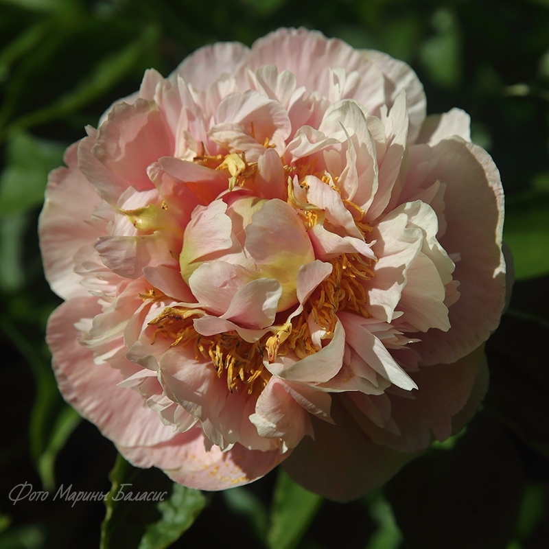 Оранжевый Сад on vk.com: “The double, cream-colored flower is 17-18 cm in diameter. The outer petals are large with a slight pink tint, the stamens are yellow, and the pink stigmas are set on pale yellow-green pistils, surrounded by a symmetrical cluster of creamy petals. The bush has strong stems and large leaves. This prolific bloomer produces seeds. It blooms early.”