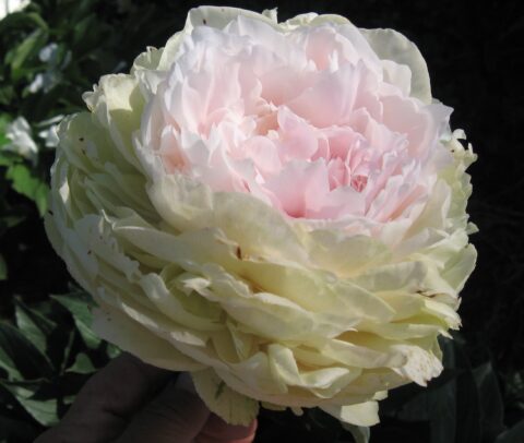 P. lactiflora variety, double (rose-type), D20 cm, white-cream with a soft pink glow in the center. Leaves are light green, broad, and glossy. The bush is upright and compact, stems are thick and strong. Height: 95 cm. Late bloomer. Faint fragrance.