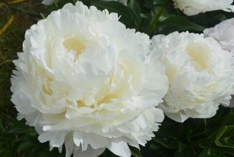 P. lactiflora variety, double (rose-type), very full; sometimes the flower develops multiple crowns. D20 cm, white with a creamy-pink tint. Stems are thick but cannot support the heavy flowers — requires staking. Height: 120 cm. Mid-season bloomer.