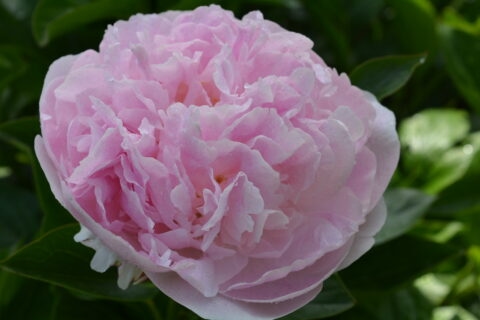 P. lactiflora variety, double, flat form, D20 cm, soft pink. Leaves are bright green, broad, and glossy. Stems are thick and strong, the bush is compact. Height: 120 cm. Early-mid season bloomer. Faint fragrance.
