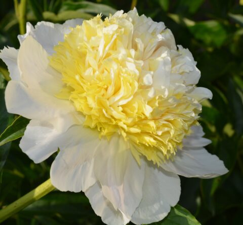 P. lactiflora variety, double bomb-type, D16 cm. Outer petals and the tuft are white with a green tint, featuring a ball of narrow yellow petals. Flowers rise above the bush. Leaves are light green. The bush is slightly spreading; stems are strong. Height: 90 cm. Early bloomer. Faint fragrance.