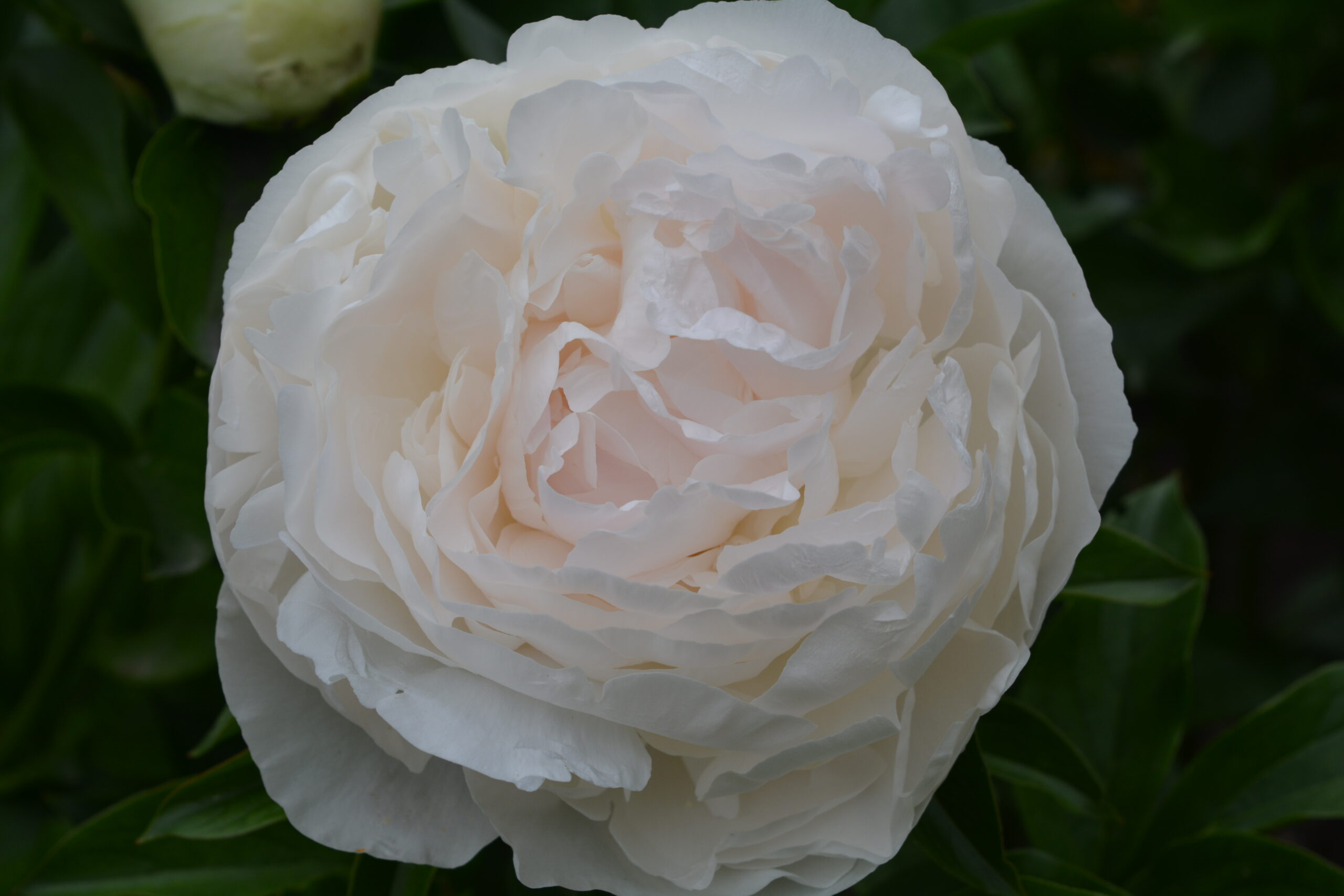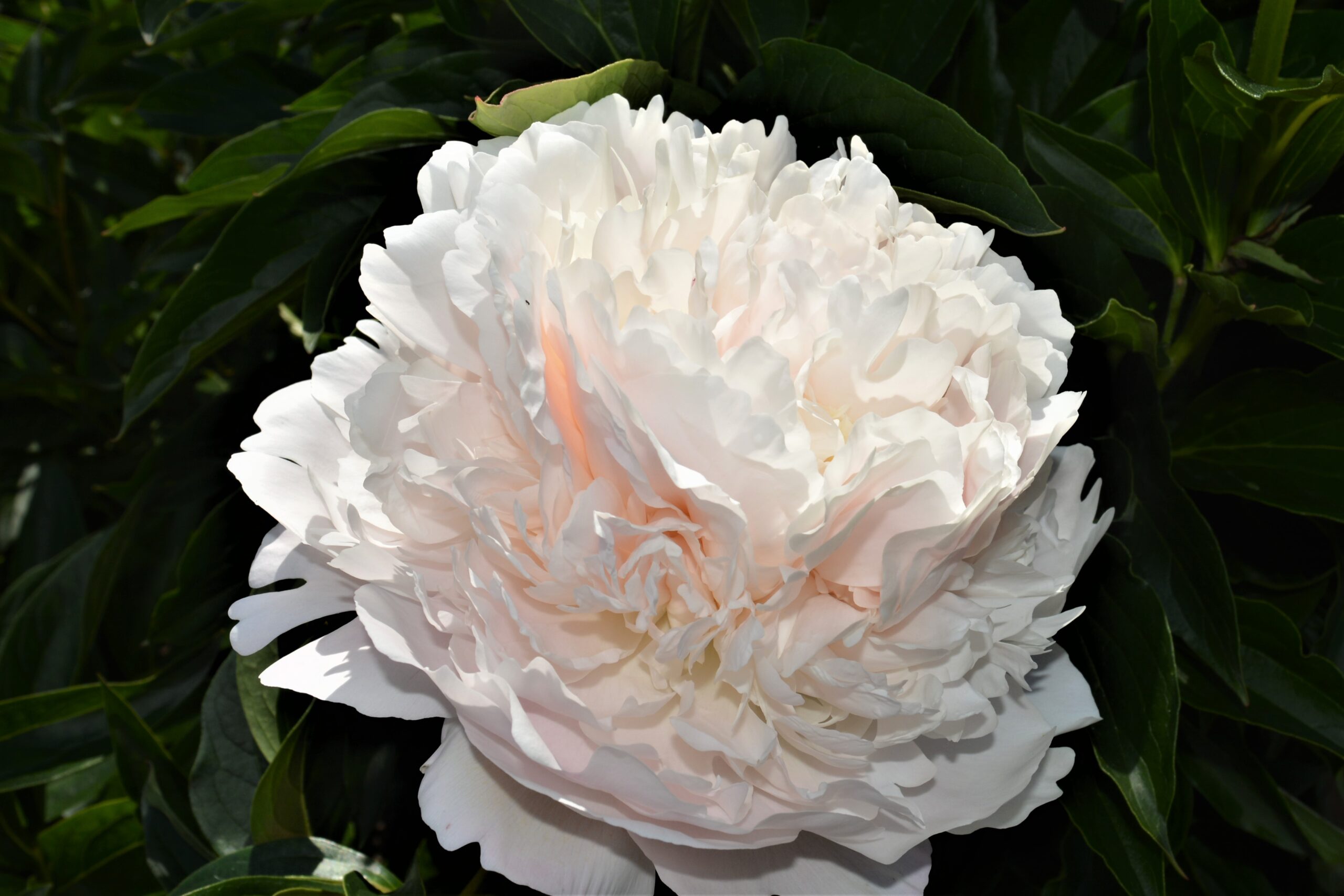 P. lactiflora variety, double (rose-type), D20 cm, white-cream with a soft pink glow in the center. Leaves are light green, broad, and glossy. The bush is upright and compact, stems are thick and strong. Height: 95 cm. Late bloomer. Faint fragrance.