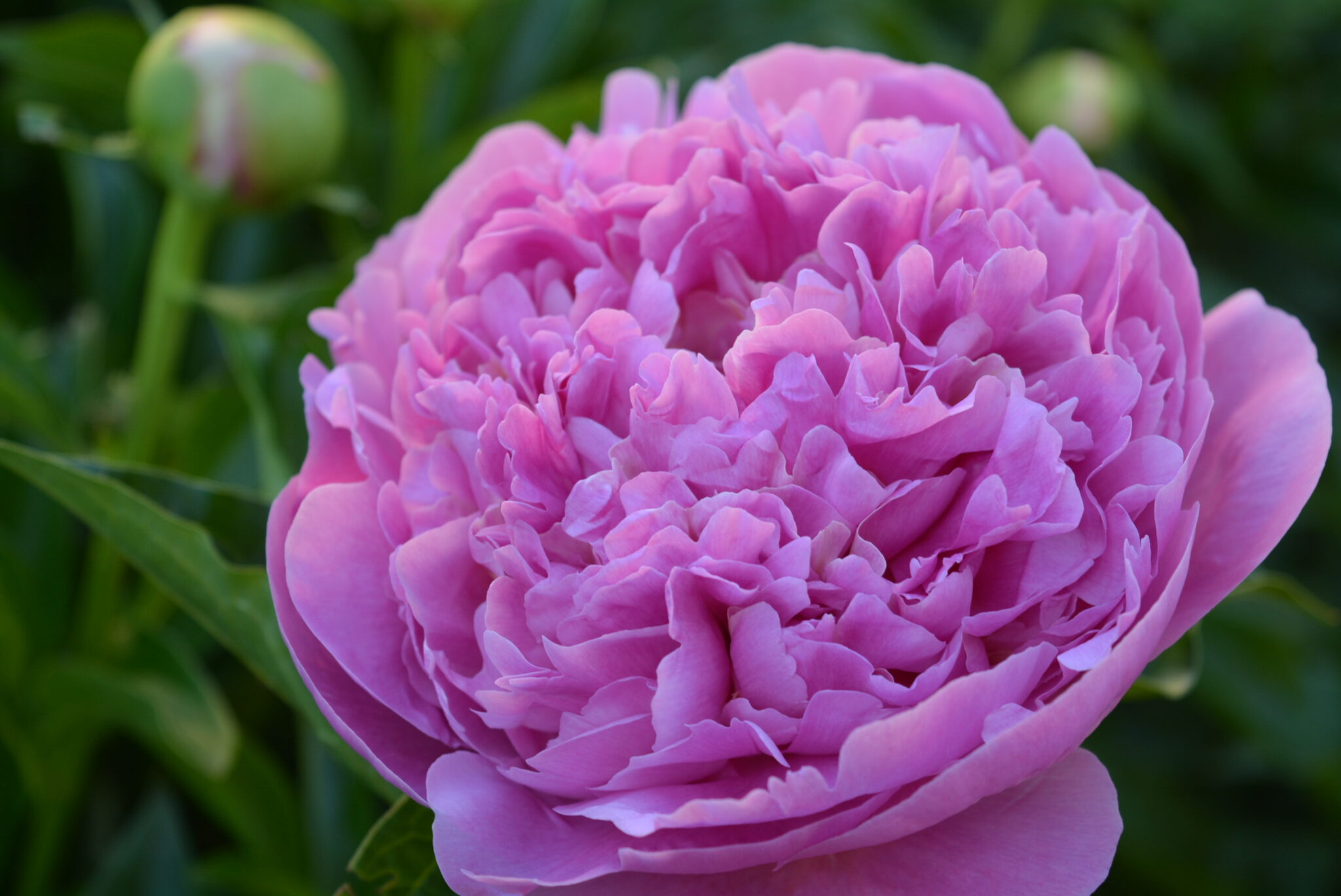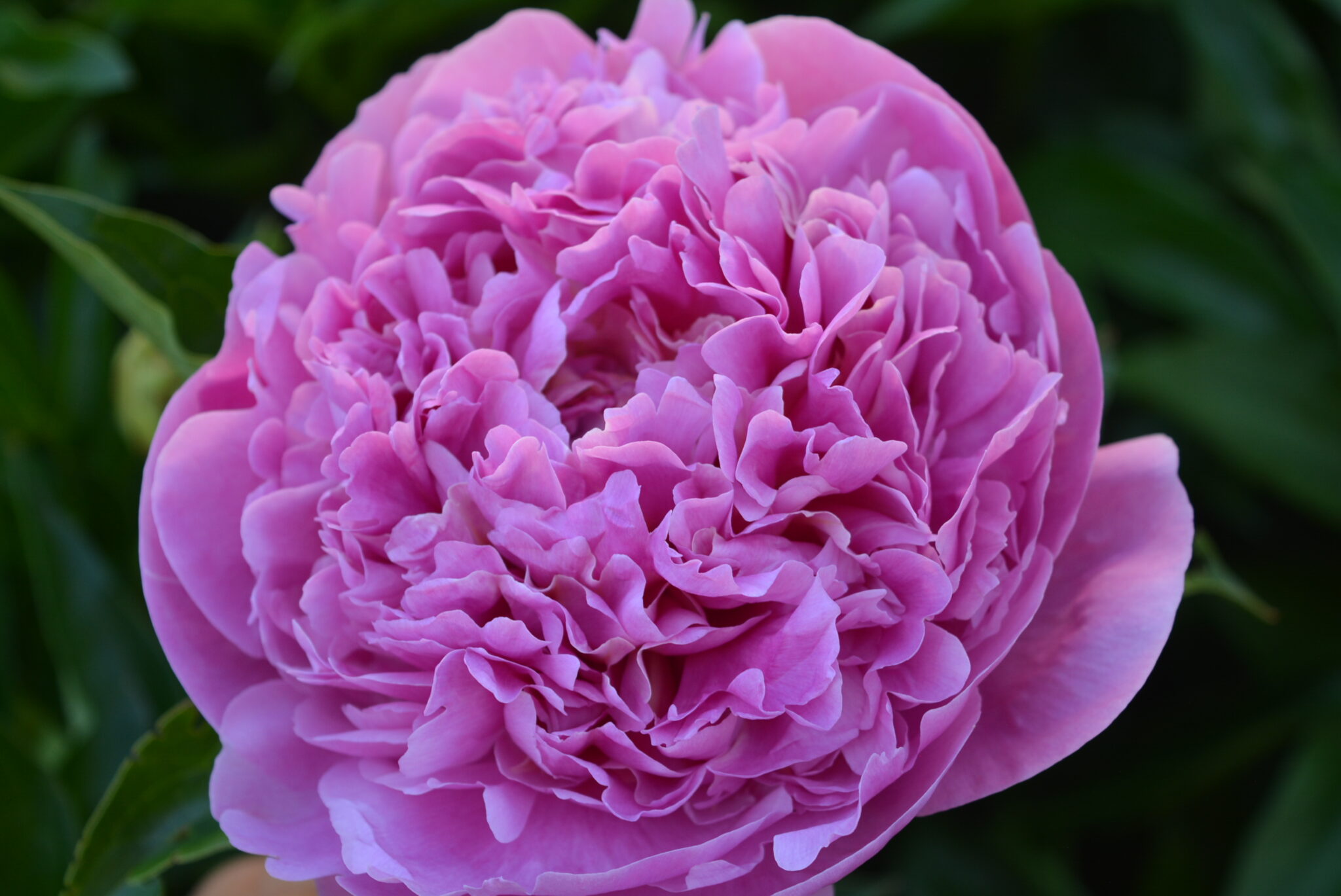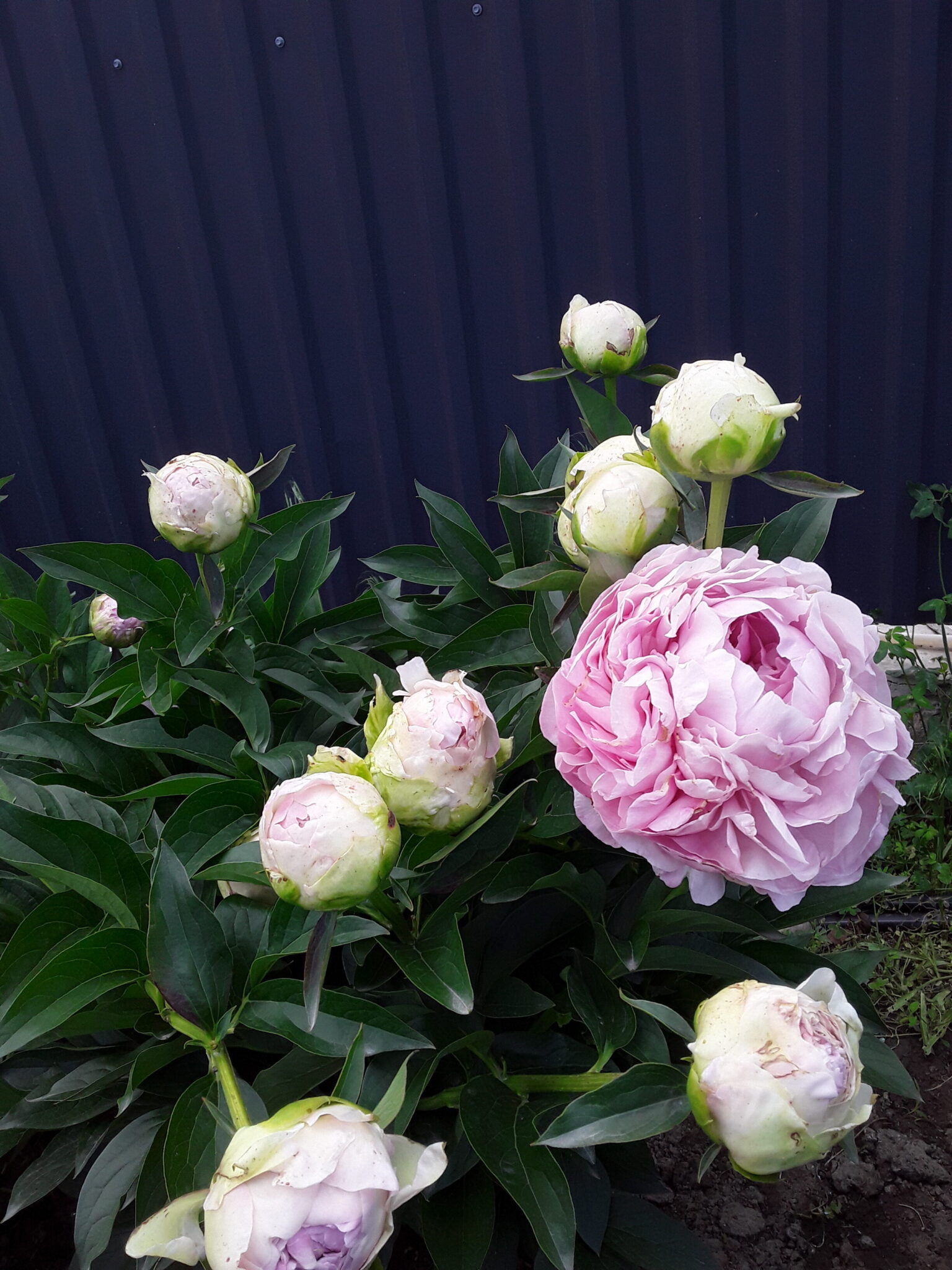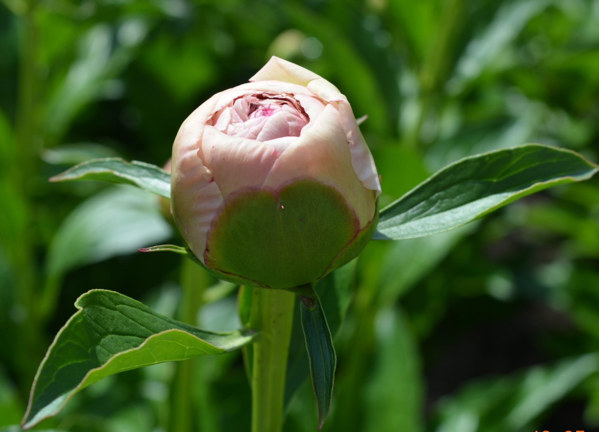 P. lactiflora variety, double, flat form, D20 cm, soft pink. Leaves are bright green, broad, and glossy. Stems are thick and strong, the bush is compact. Height: 120 cm. Early-mid season bloomer. Faint fragrance.