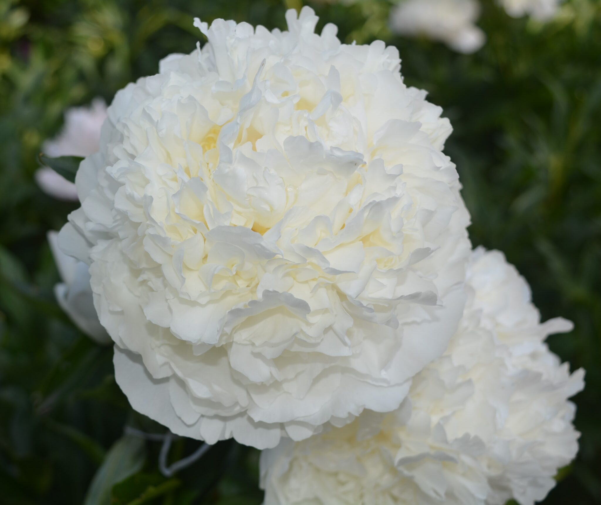 P. lactiflora variety, double (rose-type), very full; sometimes the flower develops multiple crowns. D20 cm, white with a creamy-pink tint. Stems are thick but cannot support the heavy flowers — requires staking. Height: 120 cm. Mid-season bloomer.