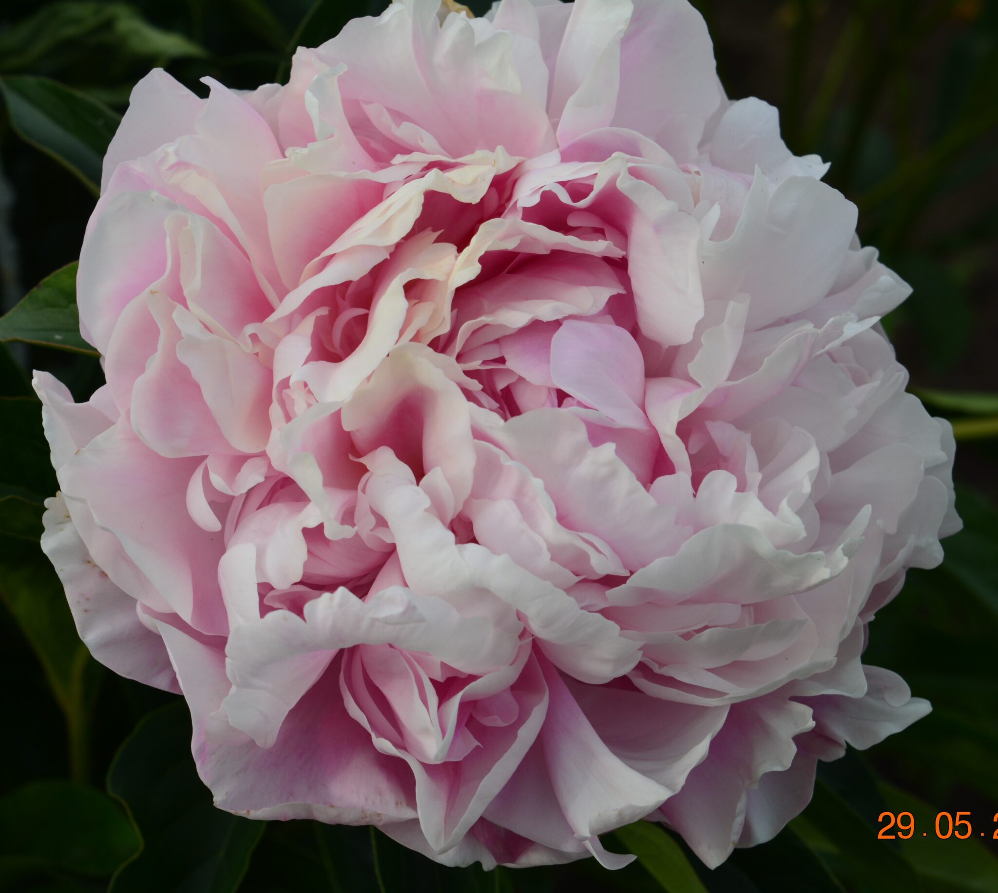 P. lactiflora variety, double (rose-type), very full, flat form, D18 cm, light pink with uneven coloring: petals are cream-colored at the base, and central petals may have a crimson edge. Fades in the sun. Stems are thick and strong. The bush is slightly spreading. Height: 80 cm. Mid-early bloomer. Faint fragrance.