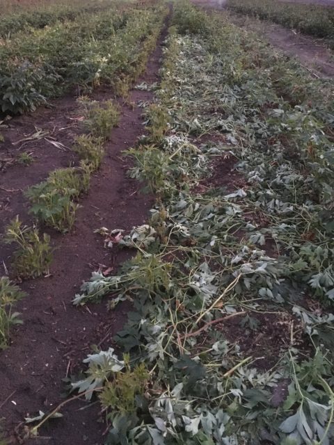 I didn’t have too many plants of it at the time, so the following year (after seeing there was no damage to them), they were dug, divided and replanted. Now, 2018, we are three years later, they have grown into large mature plants (about 160 of them) and I though the time right to do some ‘repeat’ experimenting. Thus right after flowering, June 6th, I took out my ‘mowing’-machine and mowed 100 of them flat. Not an easy task as there were many partly woody stems as is usually the case with intersectionals. Not a single leaf was left, otherwise the plants might not be triggered to start growing again from their secondary buds.