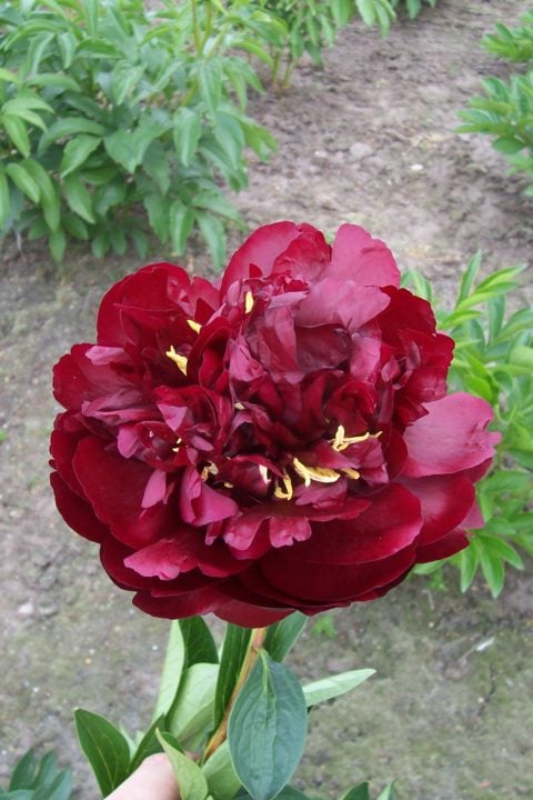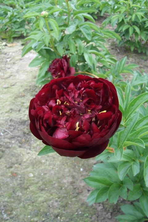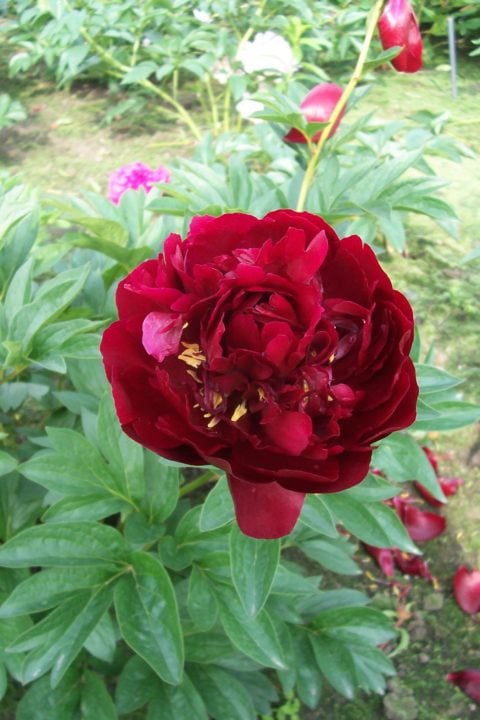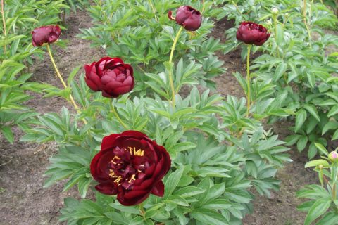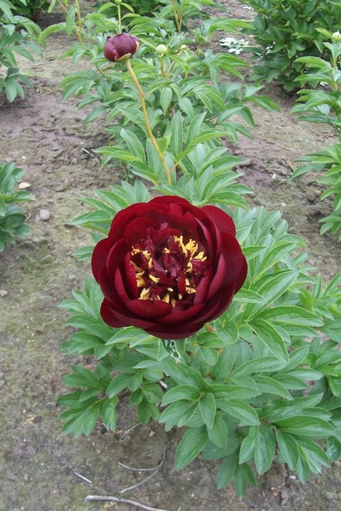 Award of Landscape Merit (ALM) description: ‘Buckeye Belle’ (Mains, 1956) Herbaceous Hybrid, Semi-double, Early, 30?, Mild scent — Moderately large flowers composed of four, or so, layers of large, dark mahogany red, cupped and rounded outer petals and narrower and more deeply cut central petaloids, interspersed among thick, yellow anthers. Centers can appear turbulent, varying from bloom to bloom and developing with age. Bowl-shaped blooms ultimately flatten and widen with age, especially in full sun. Blooms are held erect above the foliage with stems spreading slightly apart at the top of the bush. Excellent color all day—in subdued light, or when backlight in the morning or late afternoon. Leaflets are smaller and slightly warmer green than those of most non-hybrids. Spring foliage is notable for its burgundy tones. Vigorous—matures to two dozen stems, with a favorable rate of increase when divided. Roots may be more prone to rot than other cultivars in chronically wet soils, or when improperly stored after lifted for div ision. Scored high in Gold Medal deliberations the last three years. 2010 Gold Medalist and 2011 Peony of the Year