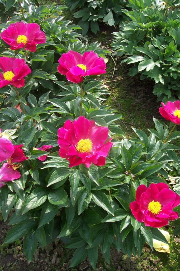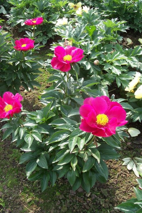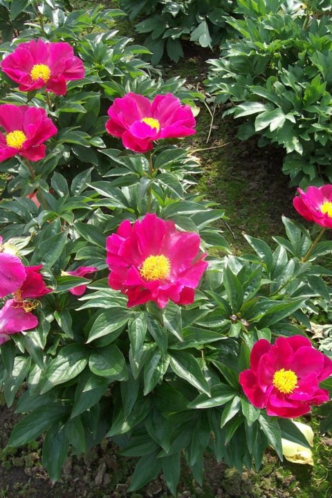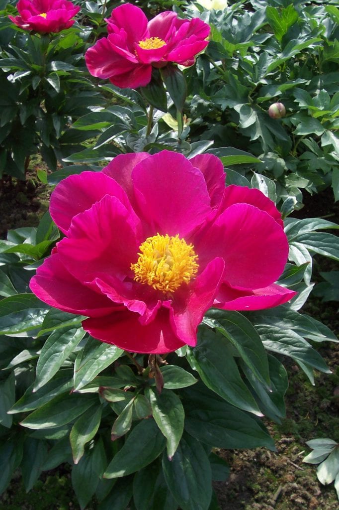 From Hollingsworth Peonies: Fairfield (Hollingsworth 1998) EM-M Single; broad, rounded petals are bright ruby red; small stamen boss is light yellow. Flowers are set close to the bush, a large terminal flower and 3-4 side buds, giving a long flowering season. Colorful throughout the spring, shoots emerge purple; heavy leaflets are dark green at maturity. Very robust, stoutly erect, excellent in the landscape. Much pollen , prolific seeder. Sibling of Color Magnet.