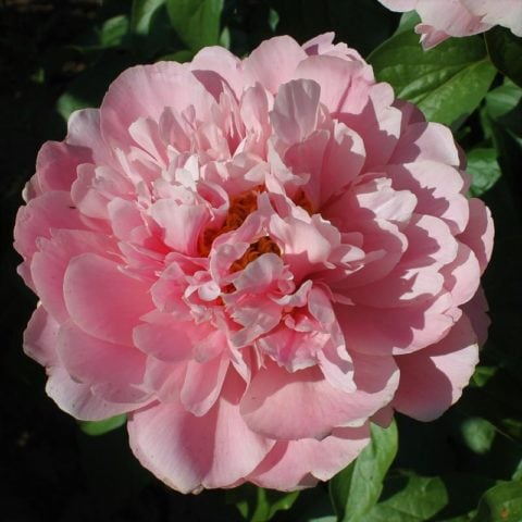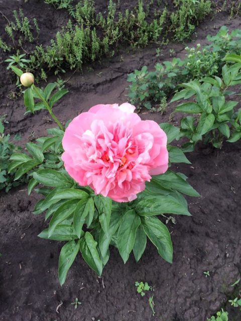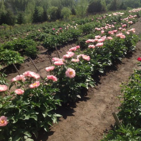 Semi-double flower form, well grown plants may produce full double flowers when mature. Salmon pink petals are of excellent substance. Color remains stable as flower matures and holds well until petal drop. One flower per stem with occasional side buds. The flowers are extra large and may reach a diameter of 8 inches. Foliage is large, dark green, broadly pointed, and holds well into autumn. Upright plant habit with thick stems needing no mechanical support makes for a handsome bush in the landscape. The bush is of medium height in the Midwest. It is a vigorous plant that shows exceptional increase and strong overall growth.