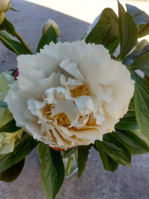 Spectacular cup-shaped white hybrid semi-double. The somewhat serrated petal-edges of the white bowl include within their circumference yellow filaments and white-yellow carpels with pink stigmata. Floriferous. Seed-fertile. Tallish bush has hybrid vigor. Leaflets of a fairly light green are veined and large. First bloomed 2001. Early. Seedling # RA 14.