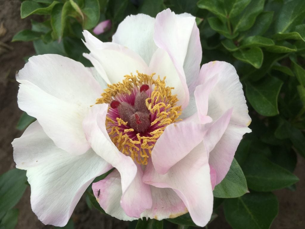 Parentage Halcyon (Halcyon F2). This hybrid is a white, rosy pink overlay single. It has good substance, stamen and pollen. An early flower 20-24 inches in height, good stem strength with 4-5 inch bloom. Small dark green foliage. This plant was a gift to Chris Laning from Silvia Saunders. Registered, and distribution by Caprice Farm Nursery.