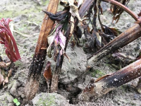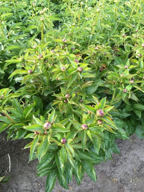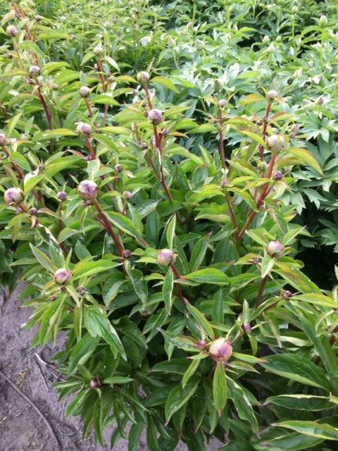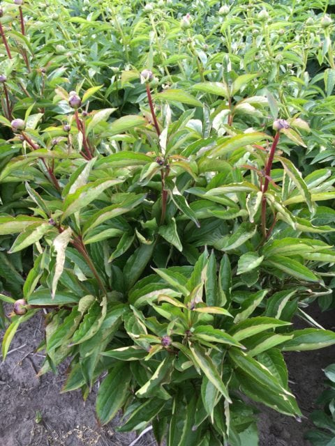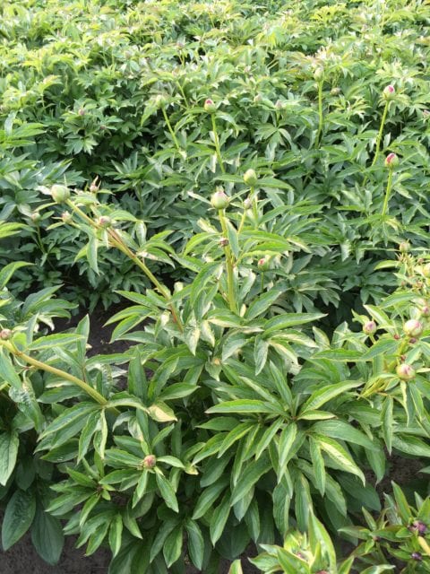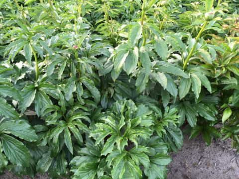 That’s not the only problem that occurred this year. I have fields of peony that have been planted in different years. A field that was planted three years ago with many different cultivars did very well, but upon closer inspection there was an issue with leaf nematodes (aphelenchoides fragariae, there’s another longer article on the website about them). When I planted this field all divisions did receive a hot water treatment to get rid of this pest. But I received three plants from another peony friend after I had given the hot water treatment. I could not start the procedure again for just three divisions and thus planted them with the others. The first year those three plants hardly flowered, but them being first year plants, nothing uncommon of course. Last year however, it was clear that they had problems with leaf nematodes as most stems didn’t give any flowers at all, whilst all other plants standing around them were perfectly fine. But as is the case with leaf nematodes, they spread from plant to plant during periods of rain or damp weather and this year in more or less a perfect circle around those three plants, several plants of other cultivars were infected as well and showed symptoms that I didn’t like and that most readers won’t like as well. Some cultivars are less susceptible than others and thus the degree of severity differs somewhat but alas, none proved to be fully resistant. See the pictures to know what I’m speaking of, there are also some pictures of plants of the same varieties that are still perfectly healthy, and these plants just happen to be only 1 meter (3 feet) further away from the infected plants, no doubt they would show disease symptoms next year if I were to let them grow there (but all shall be dug, divided and will receive their hot water cure).