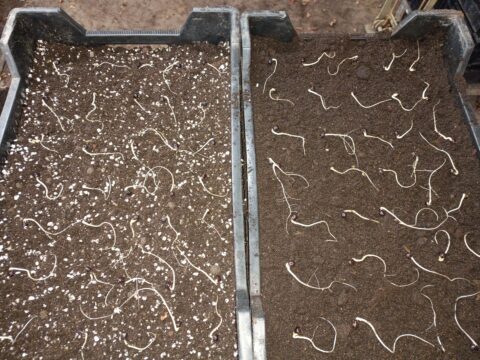 Last year we tried to find out which was the best germinating substrate for peony seeds. This year we’ve tried to find out in which substrate those germinated seedlings would grow best. We usually grow our seedlings in a potting mix consisting mostly of peat and with some coarse river sand added. Peat holds water very well and is by far the most used substrate here in Europe. It is under pressure as a substrate due to environmental concerns, so the search is on for a good replacement, but that is still a distant goal. We had the feeling that the reason some seedlings died in previous years was mostly due to excess moisture in the substrate, thus we aimed for other elements that would drain excess moisture well. We thought perlite would be a good candidate for this as it is known to improve aeration and drainage. Some other substances were also tried for the same reason: clay granules, lava and pebbles. Vermiculite was not included here as that one is known to keep water in the substrate instead of draining it, the opposite of what is needed for a perennial that detests too much moisture.