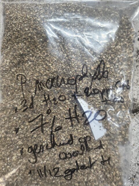 - P. macrophylla x open. 3 days of soaking with 200ppm GA3 and biostimulants. 7% water in fine grade vermiculite, well shaken before temperature treatment started Dec 11th.