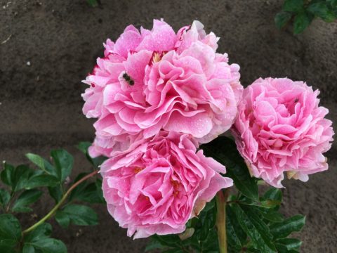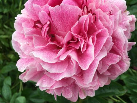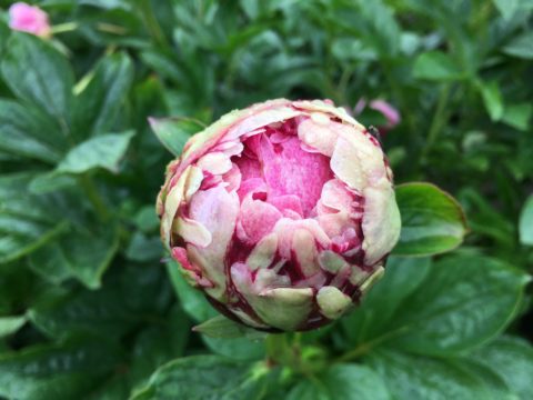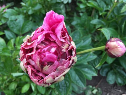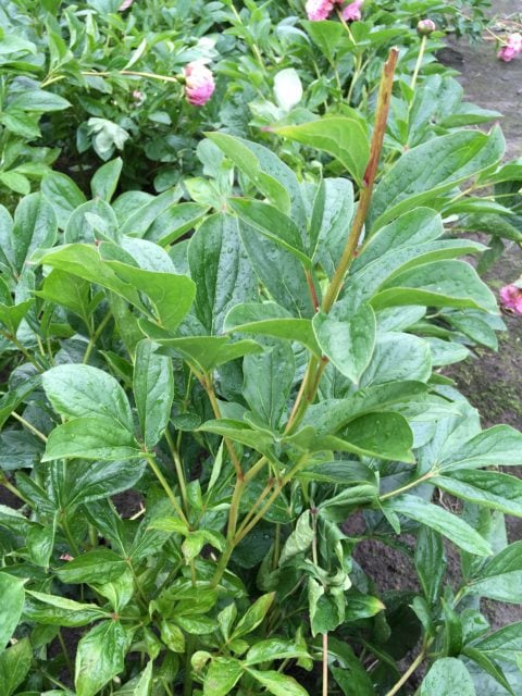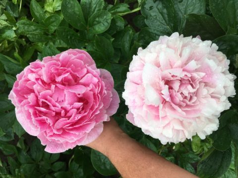 Why is this my all-time favorite lactiflora? When the young stems and foliage emerge they are deep red and this remains so for quite a while, very attractive. The red coloration reappears in Autumn and the foliage is always very healthy until late in the season. At flowering time the foliage is dark green and you have a rather tall plant (some people claim that it is somewhat short, but here it is a tall as Sarah Bernhardt). The stems are incredibly sturdy, and with an open flower they take rain and wind better even than Old Faithful can. Even the smaller stems are sturdy enough to hold the flowers. A huge improvement over so many other lactifloras. It flowers somewhat late in the season, normally just before or overlapping with Sarah Bernhardt. The flowers’ base color is indeed blush, but there are so many deep pink speckles on them that the end impression is a deep pink. The petals are nicely placed, it has a very large fully double flower with some stamens placed in between the petals. It is very, very floriferous and flowers for quite a long time, with a few (3 on average) sidebuds usually. The buds are something special. They are not rounded as with most peonies, but more ‘rose formed’, although this ‘rose form’ only appears just before opening (fortunately, otherwise rain would spoil the flowers, though it does make it difficult to keep the flowers in cold storage when there’s water in between the petals of the flowers). Pale pink at the outer edges at first and then, when about to open, they change their color and become deeper pink. As a cutflower they should be harvested only at this time, not earlier, or they will not open as well (they will open, but far smaller). It’s a fantastic cutflower with the sturdy tall stems that never bend over in a vase, they keep longer than Sarah Bernhardt as well. Only problem is that you must sometimes convince your customers that the ‘rose buds’ are not open flowers but still true peony buds. And whatever you may hear, it is not as pale pink as Sarah Bernhardt, thus it is not an improved replacement for it.