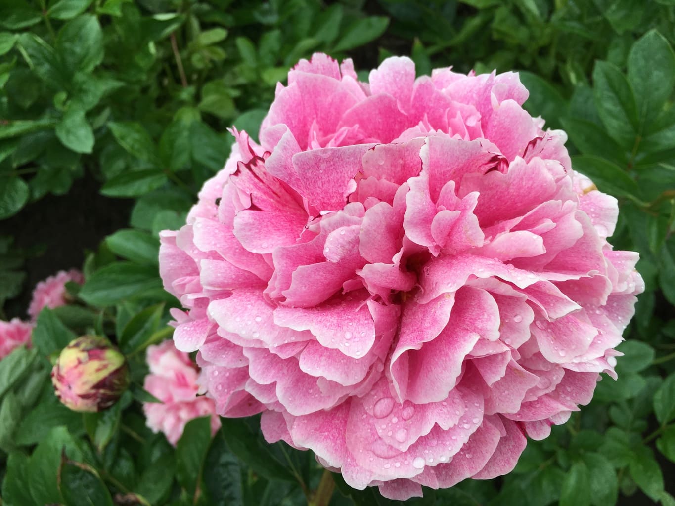 Why is this my all-time favorite lactiflora? When the young stems and foliage emerge they are deep red and this remains so for quite a while, very attractive. The red coloration reappears in Autumn and the foliage is always very healthy until late in the season. At flowering time the foliage is dark green and you have a rather tall plant (some people claim that it is somewhat short, but here it is a tall as Sarah Bernhardt). The stems are incredibly sturdy, and with an open flower they take rain and wind better even than Old Faithful can. Even the smaller stems are sturdy enough to hold the flowers. A huge improvement over so many other lactifloras. It flowers somewhat late in the season, normally just before or overlapping with Sarah Bernhardt. The flowers’ base color is indeed blush, but there are so many deep pink speckles on them that the end impression is a deep pink. The petals are nicely placed, it has a very large fully double flower with some stamens placed in between the petals. It is very, very floriferous and flowers for quite a long time, with a few (3 on average) sidebuds usually. The buds are something special. They are not rounded as with most peonies, but more ‘rose formed’, although this ‘rose form’ only appears just before opening (fortunately, otherwise rain would spoil the flowers, though it does make it difficult to keep the flowers in cold storage when there’s water in between the petals of the flowers). Pale pink at the outer edges at first and then, when about to open, they change their color and become deeper pink. As a cutflower they should be harvested only at this time, not earlier, or they will not open as well (they will open, but far smaller). It’s a fantastic cutflower with the sturdy tall stems that never bend over in a vase, they keep longer than Sarah Bernhardt as well. Only problem is that you must sometimes convince your customers that the ‘rose buds’ are not open flowers but still true peony buds. And whatever you may hear, it is not as pale pink as Sarah Bernhardt, thus it is not an improved replacement for it.
