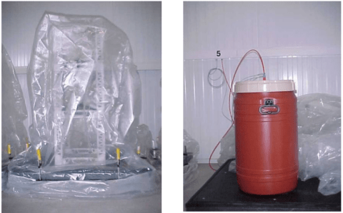 In 2007 an article appeared in a trade journal, Vakblad voor de Bloemisterij, wherein a grower reported to keep his peonies in such storage to be able to sell them several months later when no other grower would have any. Interested by this, we decided to try it out, together with PCS, a research station here in Belgium. So the following year I harvested some flowers and the PCS collected them here and did some tests. They had contacted the firm that did the treatment for the grower in Holland and were duly informed that the grower would not repeat it as it had shown too much problems, but they did give us the air composition. The air we all breathe contains some 21% oxygen, 0,03% carbon dioxide and the rest is nitrogen. The ULO-treatments tested were either 10% O2 and 8% CO2, or 3% O2 and 5% CO2, with a planned storage period of 12, 16 and 20 weeks, and then some tests at the beginning and at the end with normal storage. We used fully closed tubs to do the testing as these would not let any oxygen through. On the image below you can see a Palistore system on the left, which is essentially a plastic covering that does the same thing and which is used for somewhat larger volumes than those that can be placed in a tub, as you can see on the right.